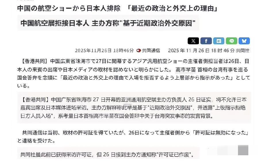 珠海航展拒绝接待日本人! 珠海航展27日开幕,主办方26日确认不接待日本嘉宾及媒体,理由是“近期原因”。 日本共同社26日曾发稿称,已获得本届航展采访许可证,但不久后被通知作废。 主办方不接待日本媒体和嘉宾的决定引发网友讨论。 有人说应该让日本媒体来,“让他们看看我们的进步”,也有人提到日本曾在岩国航展上限制东方大国人员入场,认为这次应该“先礼后兵”。 也有网友指出,不接待日本媒体的原因应归咎于日本高市早苗。 麻烦看官老爷们右上角点击一下“关注”,既方便您进行讨论和分享,又能给您带来不一样的参与感,感谢您的支持!