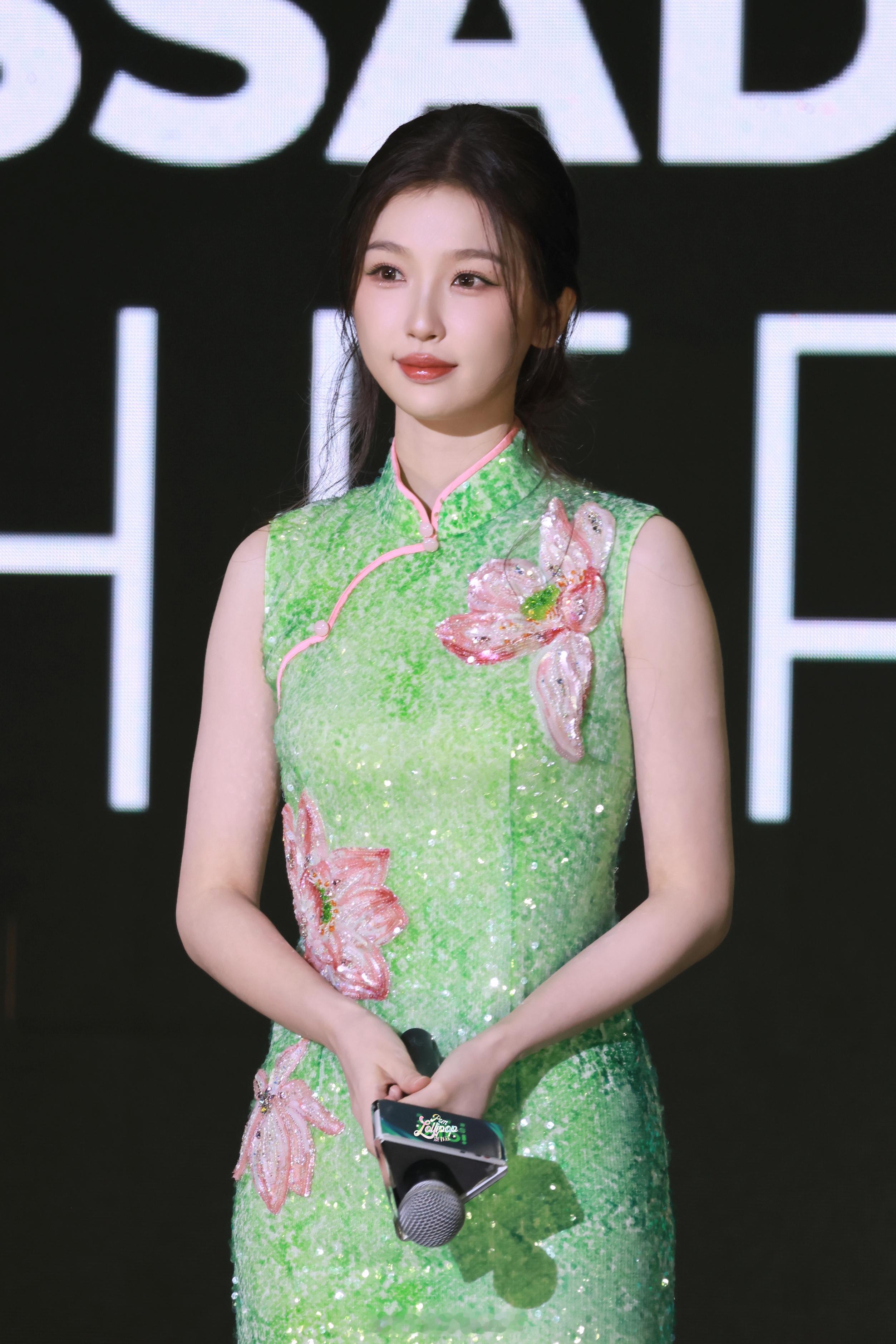 虞书欣绿色绣花旗袍印尼见面会第二套造型路透,真的好优雅呀!