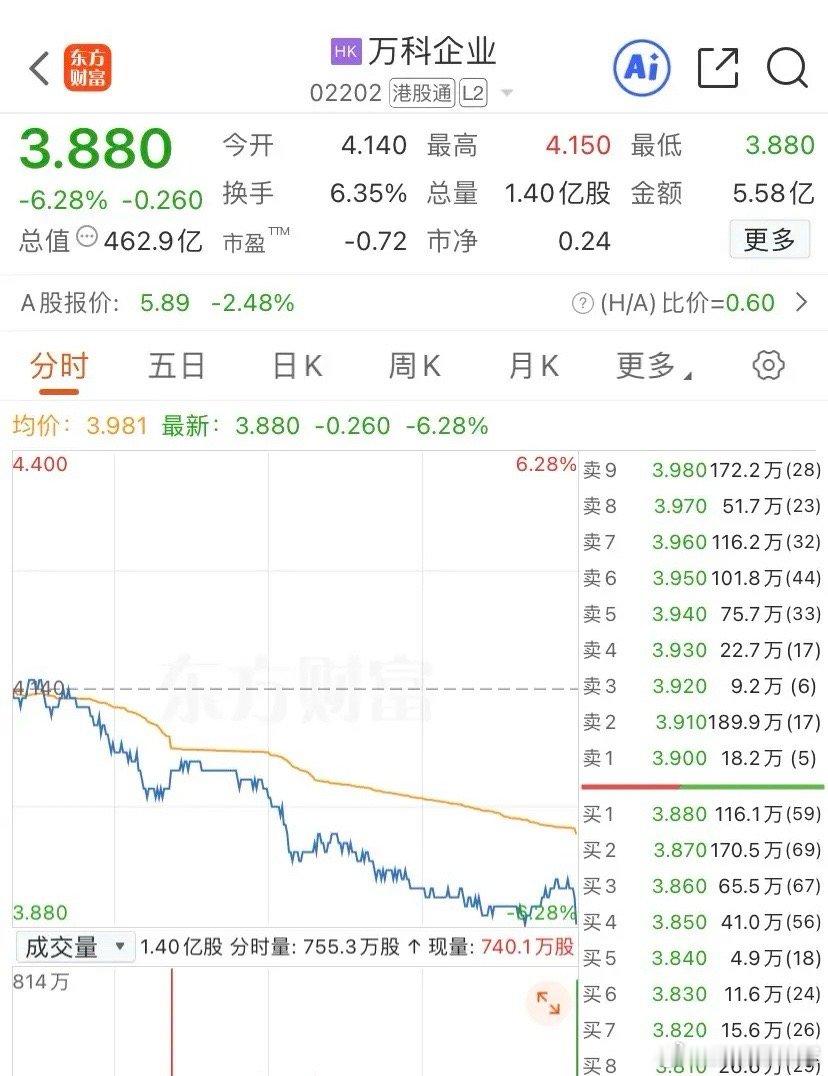 5.89元的万科股价高不高?我觉得还很高,说说我的个人看法:1.虽然目前万科的股价仅5.89元,但是我们看看他的复权价格,目前依旧是1941元,对比A股一开始诞生是100点,目前指数是3700点,涨37倍。这样看来万科复权后价格还是涨幅很大的。2.再看万科的港股,港股价格可以反映出外资对万科的真实价值态度,而目前万科的港股股价是3.88港元,相当于A股溢价了60%。这也说明如果你真的看好万科,觉得深铁能盘活万科,那更应该考虑万科的港股而不是A股。3.有道是好事不出门坏事传千里,目前万科债务缠身,虽然有大股东深铁不断的帮扶,目前看不到情况反转下,相当于利空以及潜在的利空会让资金顾虑重重,自然就没有抄底一说了。4.最后房地产看政策,目前是相关政策的空窗期,自然也没有主力机构会太过于关注。综合来看,对于5块多钱的万科股价,只可远观,而不能抄底,如果你胆大,想博弈长线,那还不如去做万科的港股,起码便宜60%了。