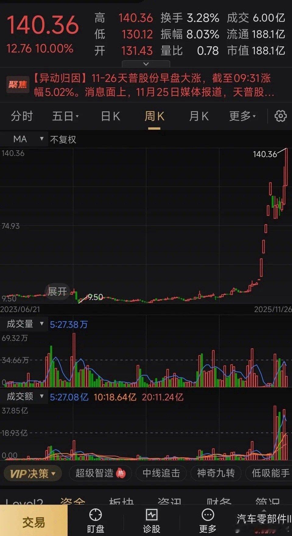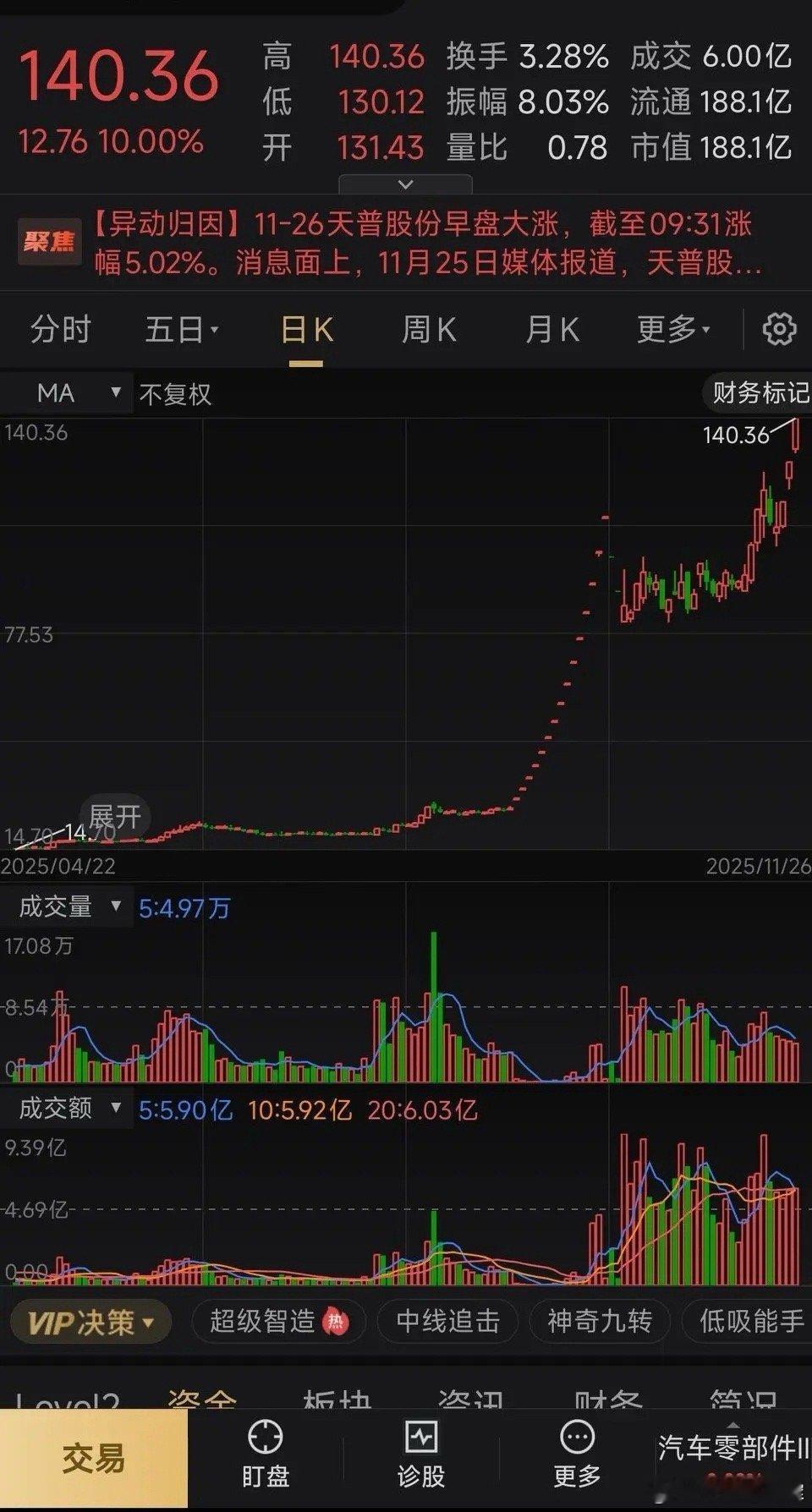 年内又一只10倍股诞生,从年初的12.59元涨到目前的140.36元,涨幅高达1114.85%,股价再次突破历史新高!继昨天涨停后今天再次涨停并创出了历史新高,最近三天的涨幅已经接近30%,从今年的1月2日的12.59元到目前的140.36元,累计涨幅已经达到了1114.85%,为年内10倍股再添一员!自从8月21日公布控股股东向中昊芯英协议转让股份后,该股连续走出了15个一字涨停板,股价一口气从26.64元涨到了111.28元,15𠆤涨停板的涨幅就超过了317.72%,虽然打开涨停板后三个交易日连续跌停,但是第三个跌停被打开了,随后的一个月股价在80元~100元之间调整,直到11月17日再次开启向上进攻,11月17日~19日3个交易日累计上涨26%,调整二天后在接下来的三个交易日又上涨了接近30%,目前最新的股价已经涨到了140.36元。值得一提的是中昊芯英(杭州)科技有限公司要约收购公司股份的收购价格仅为23.98元/股,预定要约收购股份数量为33520000股,占公司总股本的25.00%。要约收购期限为2025年11月20日至2025年12月19日。大家知道收购价23.98元是什么概念吗?相比于如今140.36元的股价,它一收购每股就净赚116.38元,可想而知该股以后的减持压力有多大,毕竟中昊芯英已经启动了独立上市的程序了,所以说借壳这个故事已经讲完了,真不明白为什么还有那么多人往里冲,难道就真的不怕高处不胜寒吗?