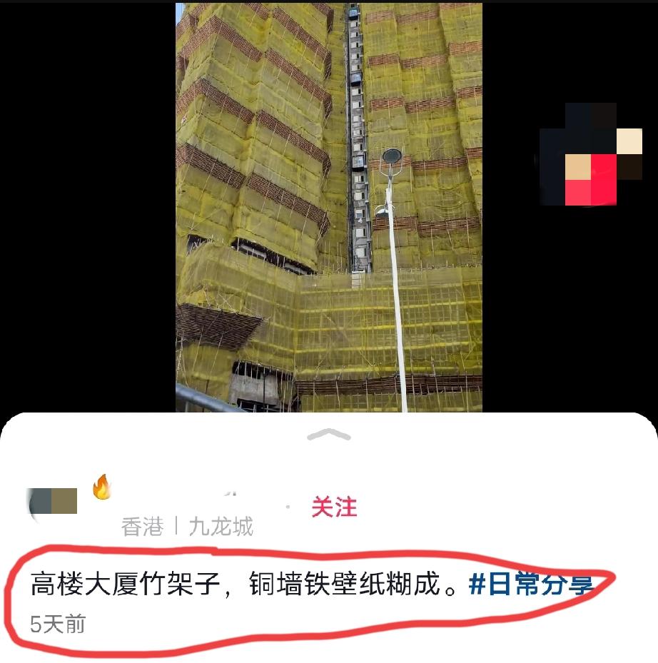 五天之前,有香港网友发视频称:高楼大厦竹架子,铜墙铁壁纸糊成…… 评论区广西网友第一时间发布评论:着火怎么办。 这下,真的被他一语成谶了!“好事不灵坏事灵”,所以说啊,忌讳的话还是尽量不要说为好! 香港的这场大火,可以说牵动了无数国人的心,但愿那些失联的人最后都能安然无恙。