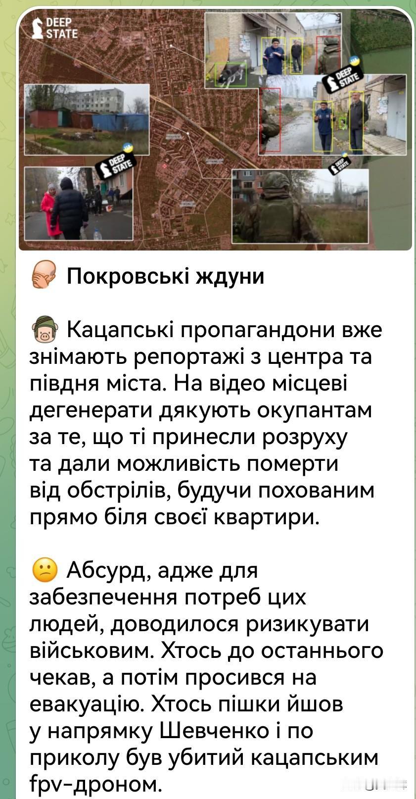 【“感谢他们带来毁灭?”】11月27日,乌克兰的DeepState报道,俄罗斯战地记者在波克罗夫斯克市中心和城南拍摄报道。视频里,当地居民对俄军表达感谢。但DeepState反问道:“感谢他们带来毁灭?感谢他们让自己能死于炮击?还能直接葬在自家公寓旁边?”