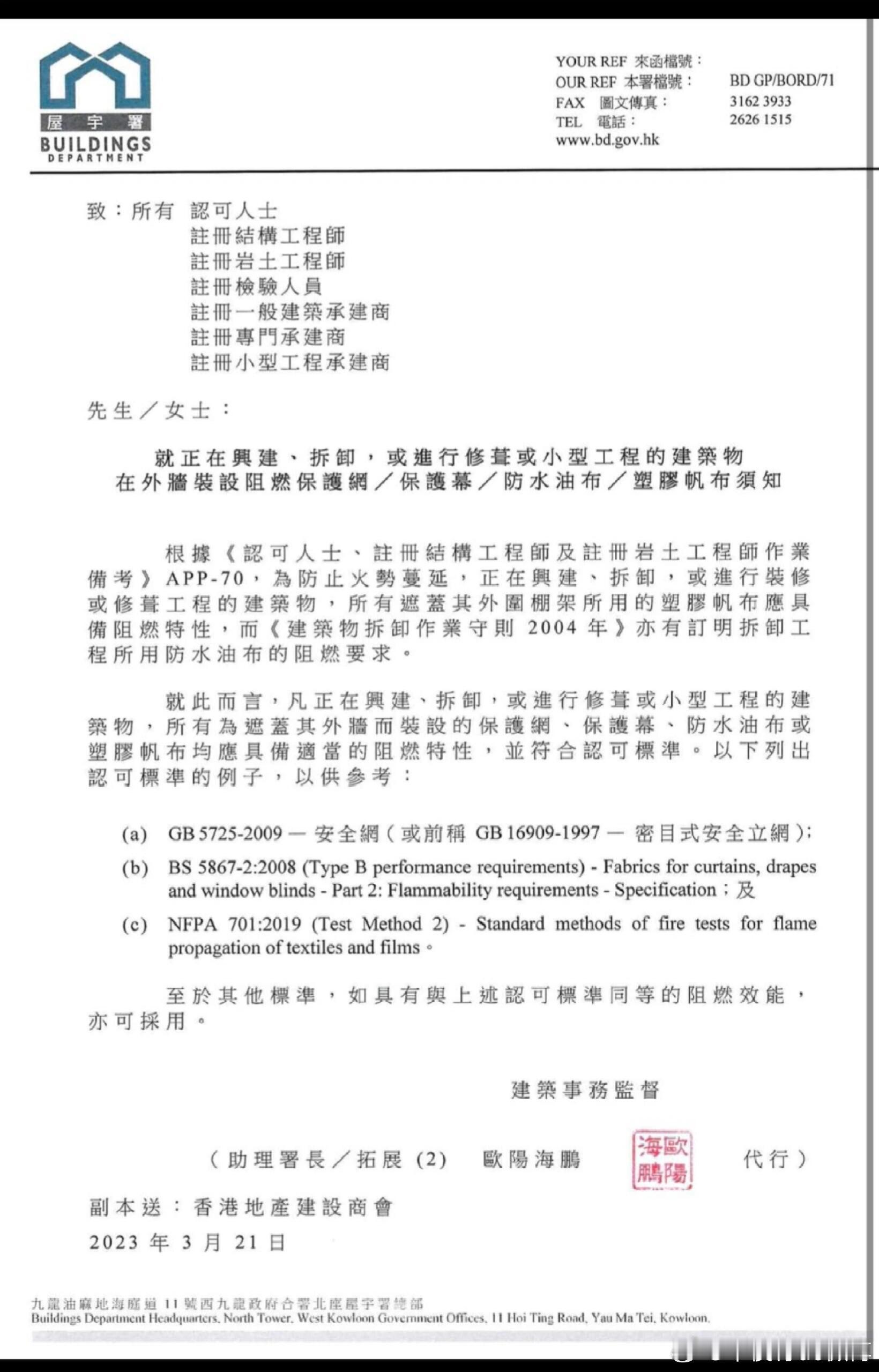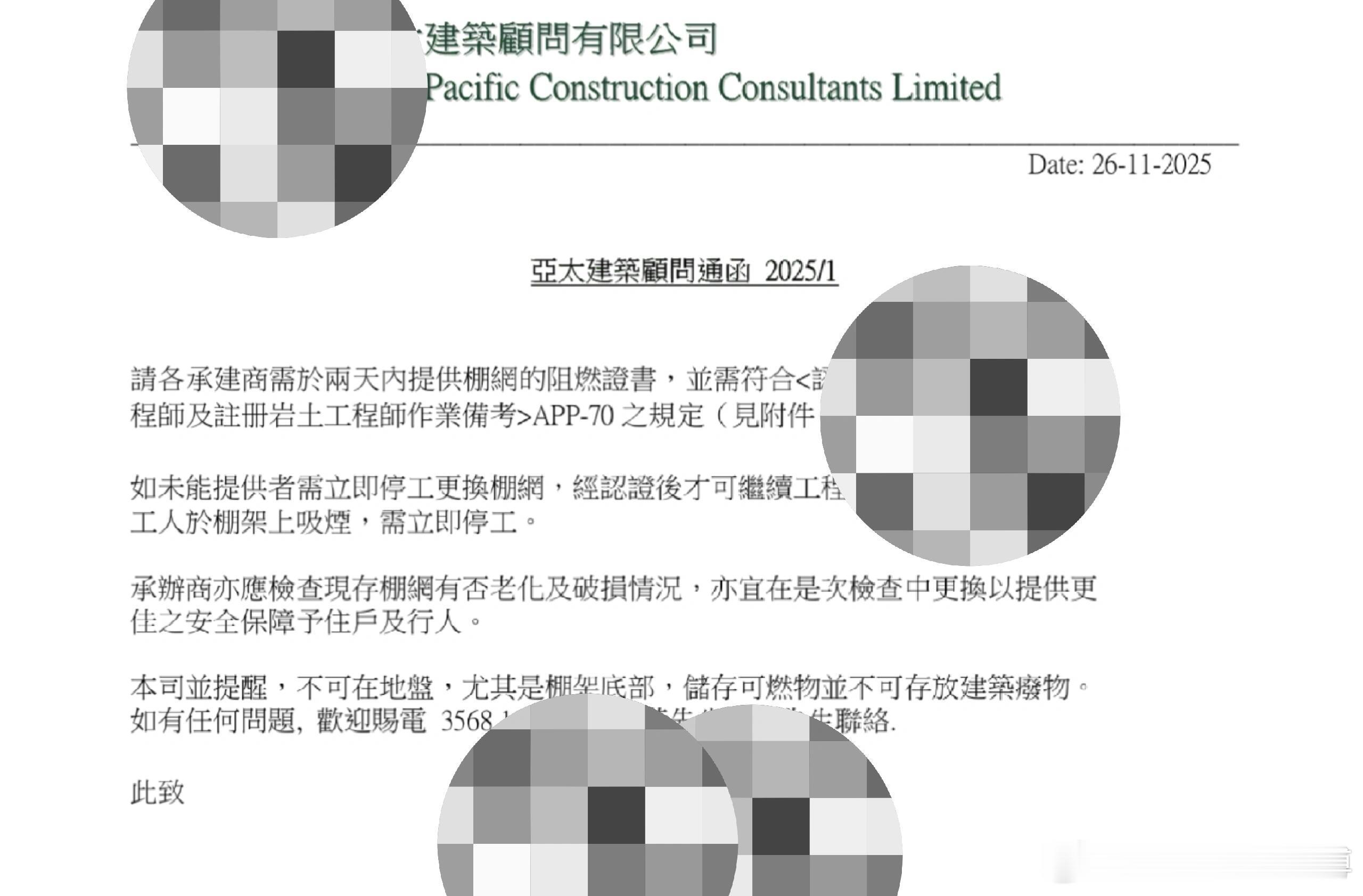 香港建筑圈紧急通知!承建商需2天内交。这两天,香港建筑领域接连有重要动态!先是火灾后工程顾问发函要求承建商提交防火合规资料,紧接着xx建筑顾问有限公司又发布通函,直接给了明确时间限制——所有承建商要在2天内提交棚网的阻燃证书,且得符合《认可人士、注册结构工程师及注册岩土工程师作业备考》APP - 70的规定(附相关附件)~通函里的重点要求一定要记好:- 要是拿不出阻燃证明,得立刻停工更换棚网,等认证通过才能复工;- 工地里要是发现工人在棚架上吸烟,同样要马上停工;- 承建商还得检查现有棚网有没有老化、破损的情况,这次检查就得把有问题的棚网换掉,给住户和行人更扎实的安全保障;- 工地(特别是棚架底部)不能堆放可燃物、建筑垃圾。这次一系列动作,都是为了进一步核查建筑材料、施工工艺等是否满足防火规范。毕竟火灾防控是建筑安全的重中之重,承建商得赶紧把涉及防火的材料认证、施工方案合规性证明这些资料都准备好提交,确保项目从材料到施工都能达到防火标准,降低后续火灾风险。香港屋宇署2023发的通知涉及建筑外墙的防护网、防水油布这些材料,必须得有阻燃性能!这份给认可人士、注册工程师、建筑承建商等的通知里说,正在兴建、拆卸或修葺的建筑,外墙装设的防护网、防护幕、防水油布、塑胶帆布,都得具备合适的阻燃特性,还要符合认可标准。给大家划重点认可标准举例:- GB 5725-2009(安全网,之前叫GB 16909-1997密目式安全立网);- BS 5867-2:2008(窗帘、帷幔这类织物的阻燃性能要求);- NFPA 701:2019(纺织品和薄膜的火焰传播测试方法)。要是有其他标准能达到同等阻燃效果,也能采用~这可是为了防止火势蔓延,保障建筑安全的重要规定,做建筑相关的宝子们一定要留意呀!香港警方以涉嫌误杀罪拘捕3人香港火灾已致44人遇难香港市民自发帮助救灾运物资 香港警方以涉嫌误杀罪拘捕3人