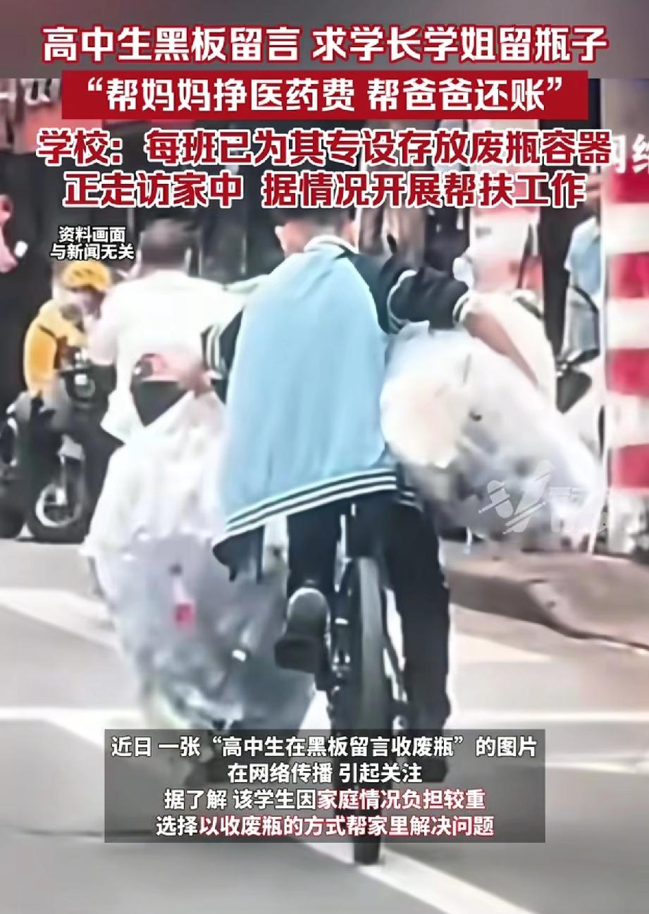 一高中生在黑板上留言 恳求学长学姐留瓶子 原因是帮妈妈挣医药费 帮爸爸还10万元农债 学校悄悄在每个班级里设置了装瓶子的桶 没有人追问细节,只是悄悄把善意装进桶里 这位高中生会在放学间隙安静的去把瓶子收起来 这份默契里藏着对少年尊严的守护 在最要面子的年纪却撑起了一家 困境中的少年没选择退缩 学校也没有刻意的张扬善意 看的心里暖暖的