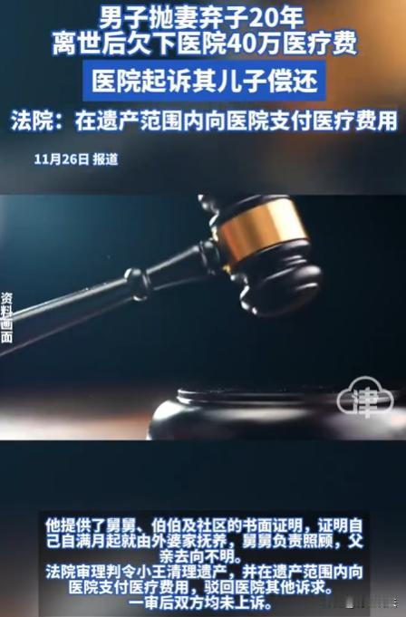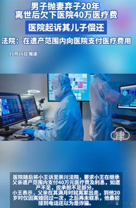 江苏南通,男子老王,儿子未满月便抛妻弃子,20多年未尽抚养义务,仅回来一次还是办离婚,老王在路边昏倒被送医,治疗2年后欠了400000元医疗费后去世,医院找老王的儿子小王缴费,被小王拒绝,称父亲从未管过自己,医院起诉了小王,要求他在继承遗产范围内清偿40万,不够则由他承担不足部分,法院这样判了! 小王这孩子,打小就没见过父亲几面。 刚出生没满月,父亲老王就抛妻弃子跑了,这一跑就是20多年。 这20多年里,老王对儿子不管不顾,回来一次还是为了办离婚。 小王在母亲辛苦拉扯下长大,受尽了委屈,对父亲,他心里只有恨,觉得那就是个陌生人。 2022年,年近六旬的老王身体彻底垮了,有天在路边走着走着,突然就昏倒了。 路人赶紧把他送去进行救治,这一住就是两年,治疗下来,欠下了40万医疗费。 2024年10月,老王终究还是没能挺过去,去世了。 医院看着这40万的账单,犯了难。 找来找去,发现老王还有个儿子小王,就联系小王,让他来缴费。 小王一听,直接就拒绝了。 他说自己从小到大,父亲没给过一分钱抚养费,没尽过一天父亲的责任,现在人不在了,却要自己来付这医疗费,这算怎么回事? 医院可不这么想,他们觉得小王是老王的儿子,有义务承担这医疗费。 多次联系小王,小王态度都很坚决,就是不肯付。 医院没办法,一纸诉状把小王告上了法庭,要求他在继承老王遗产的范围内清偿这40万医疗费,要是遗产不够,就由他承担不足部分。 有人觉得小王太可怜,从小没得到过父爱,现在还要为父亲的债务买单,这不公平。 也有人觉得,小王作为儿子,还是应该承担一部分责任。 那么,小王到底有没有义务付这40万的医疗费呢? 根据《民法典》第1161条规定,继承人以所得遗产实际价值为限清偿被继承人依法应当缴纳的税款和债务。超过遗产实际价值部分,继承人自愿偿还的不在此限。继承人放弃继承的,对被继承人依法应当缴纳的税款和债务可以不负清偿责任。 小王作为老王的唯一法定继承人,确实有对老王遗产进行清理的义务。 但这并不意味着他就要无条件地承担老王的债务。 老王欠下的40万医疗费,属于他的个人债务,应该用他自己的财产来偿还。 小王在父亲生前,没有得到过任何抚养和关爱,20多年老王都没有尽到作为父亲的责任。 现在老王去世了,小王拒绝继承他的遗产,这也是他的权利。 法院在审理的时候,会充分考虑这些因素。 医院要求小王在继承遗产范围内支付医疗费用,这是有法律依据的。 但要求小王承担遗产不足部分,这就没有法律依据了。 因为,小王并没有义务用自己的个人财产去偿还父亲的债务,除非他自愿。 而且,小王虽然作为法定继承人,但他只是遗产管理人,并不是债务承担人。 医院不能因为小王是儿子,就要求他以赡养的名义来支付这医疗费。 赡养义务和债务清偿义务,这是两码事,不能混为一谈。 小王拒绝继承遗产,是否还需要承担老王的债务? 依据《民法典》规定,继承人放弃继承的,对被继承人依法应当缴纳的税款和债务可以不负清偿责任。 小王明确表示拒绝继承老王的遗产,那么他就没有义务承担老王的债务。 小王拒绝继承遗产,法院也尊重了他的选择,没有要求他承担遗产不足部分的债务。 医院能否以小王是老王的儿子为由,要求他支付医疗费? 医院,不能这样做。 小王和老王之间虽然存在父子关系,但这并不意味着小王就要为老王的债务负责。 债务清偿义务是基于债务关系产生的,而不是基于亲属关系。 老王欠医院的医疗费,是老王和医院之间的债务关系,和小王没有关系。 医院不能因为小王是儿子,就突破法律的规定,要求他支付医疗费。 现实生活中,有些父母在生前没有尽到抚养子女的义务,去世后却留下了一大堆债务,让子女来承担。 这对子女来说,确实是不公平的。 法律在处理这类事情的时候,会充分考虑各方的利益和实际情况,做到公平公正。 亲情和法律是两码事,在亲情面前,我们不能忽视法律的规定。 作为父母,应该尽到抚养子女的义务,给子女一个温暖的成长环境。 作为子女,在父母需要的时候,也应该尽到赡养的义务。 但如果父母没有尽到自己的责任,子女也有权利维护自己的合法权益。 最终法院判决,小王对老王遗产进行清理,在清理遗产范围内向医院支付医疗费用,驳回医院其他诉求。 亲情虽然珍贵,但法律更是行为的准则。 在面对亲情和债务的问题时,要保持理性,用法律来维护自己的权益。