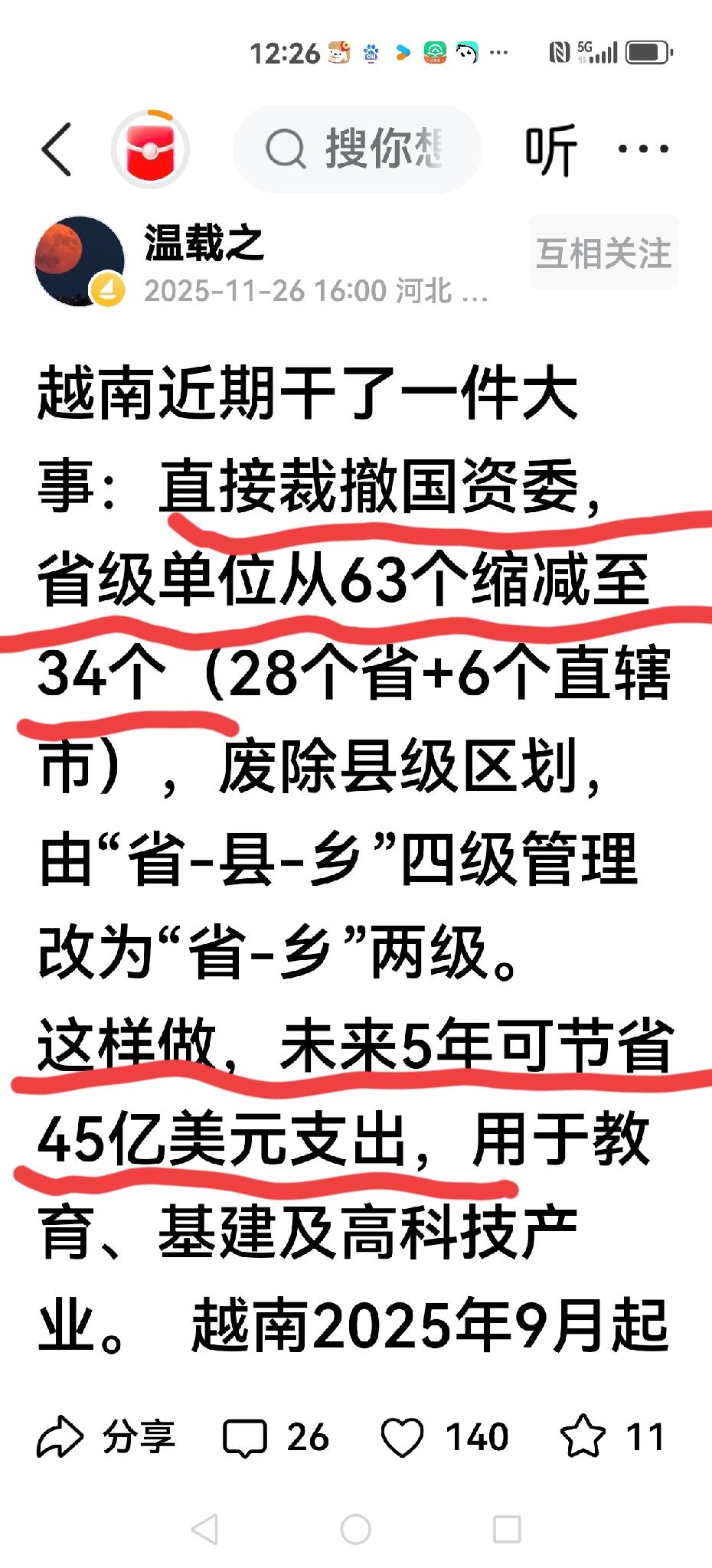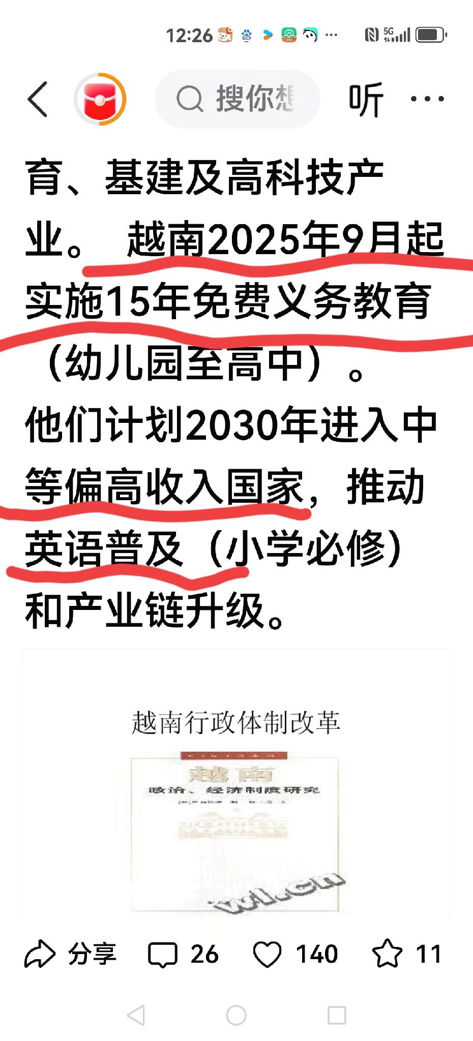 【越南的改革】 直接撤销 节省45亿美金 15年免费教育(幼儿到高中) 普及英语教育(小学必修课) 2030年达到偏高收入 看来英语教育,说明发展方向,国内前不久有些大咖提倡取消英语教育,这是遥遥领先吗?