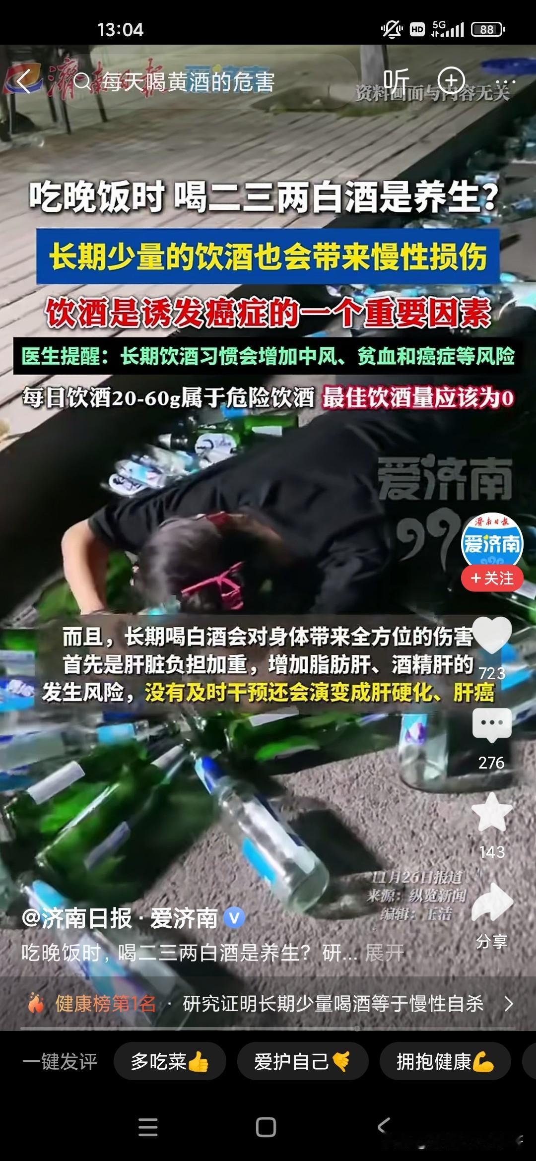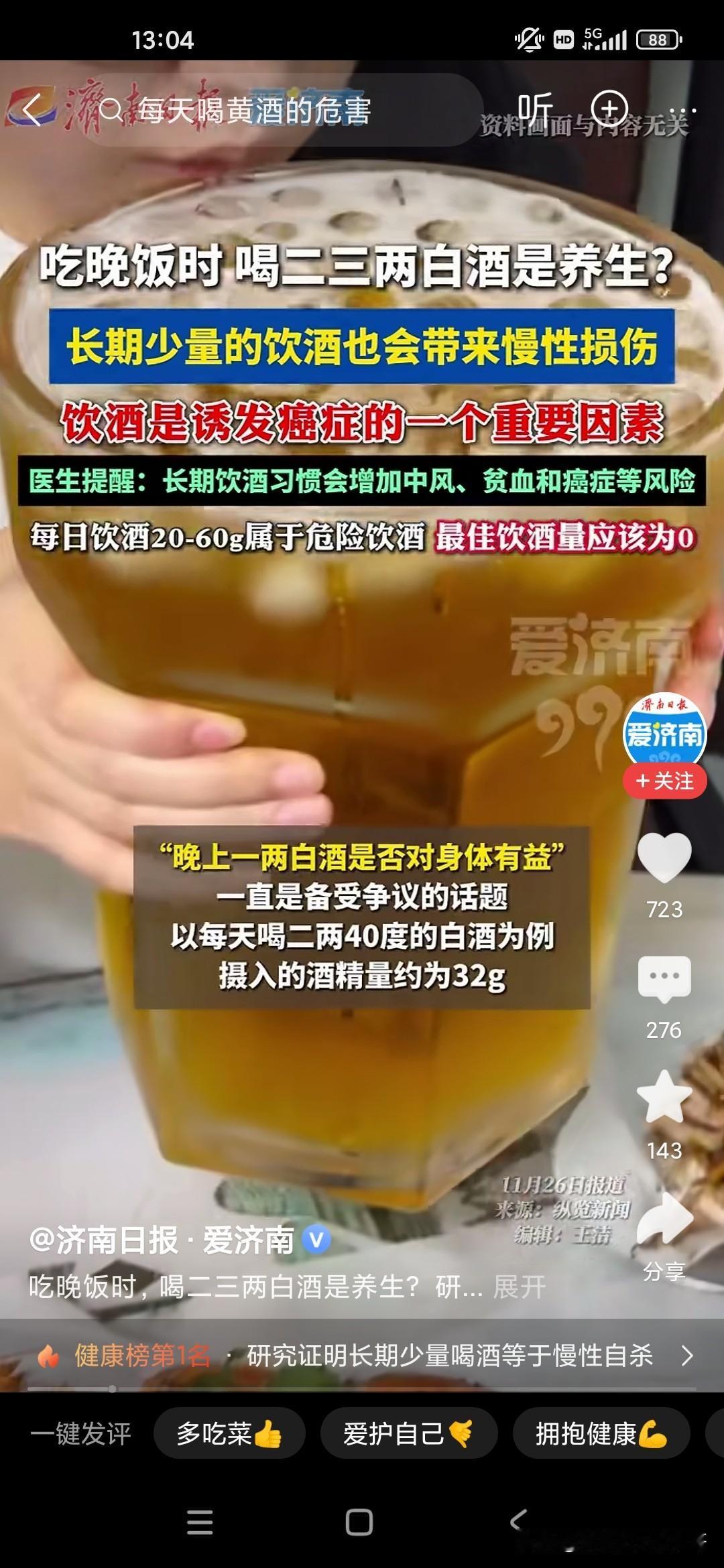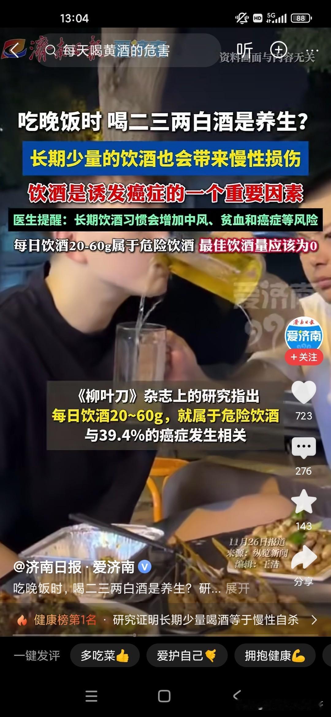 著名的医学杂志柳叶刀,经过多年的追踪研究,得出结论认为只要你喝酒就容易诱发癌症,无论你喝多少,最佳的推荐指数就是零,最好不要喝。 因为有的中国人会习惯性的每天喝个一二两,认为这样有助于养生和长寿,可以加速血液循环等等,我有时候也忍受不了夏天会喝啤酒,冬天会喝白酒,但是喝白酒居多吧,差不多每天都会喝个一二两,但今天听了他这个研究结果自己内心也的确有点儿担心和害怕,以后的话,这样逐步减少,甚至不喝,只有在逢年过节的时候可能会喝一点,这也打破了我以往的养生观念,因为以前的话,我都习惯性的每天晚睡之前会喝个一二两,有的时候甚至会多喝,我不知道大家怎么看这个事情!