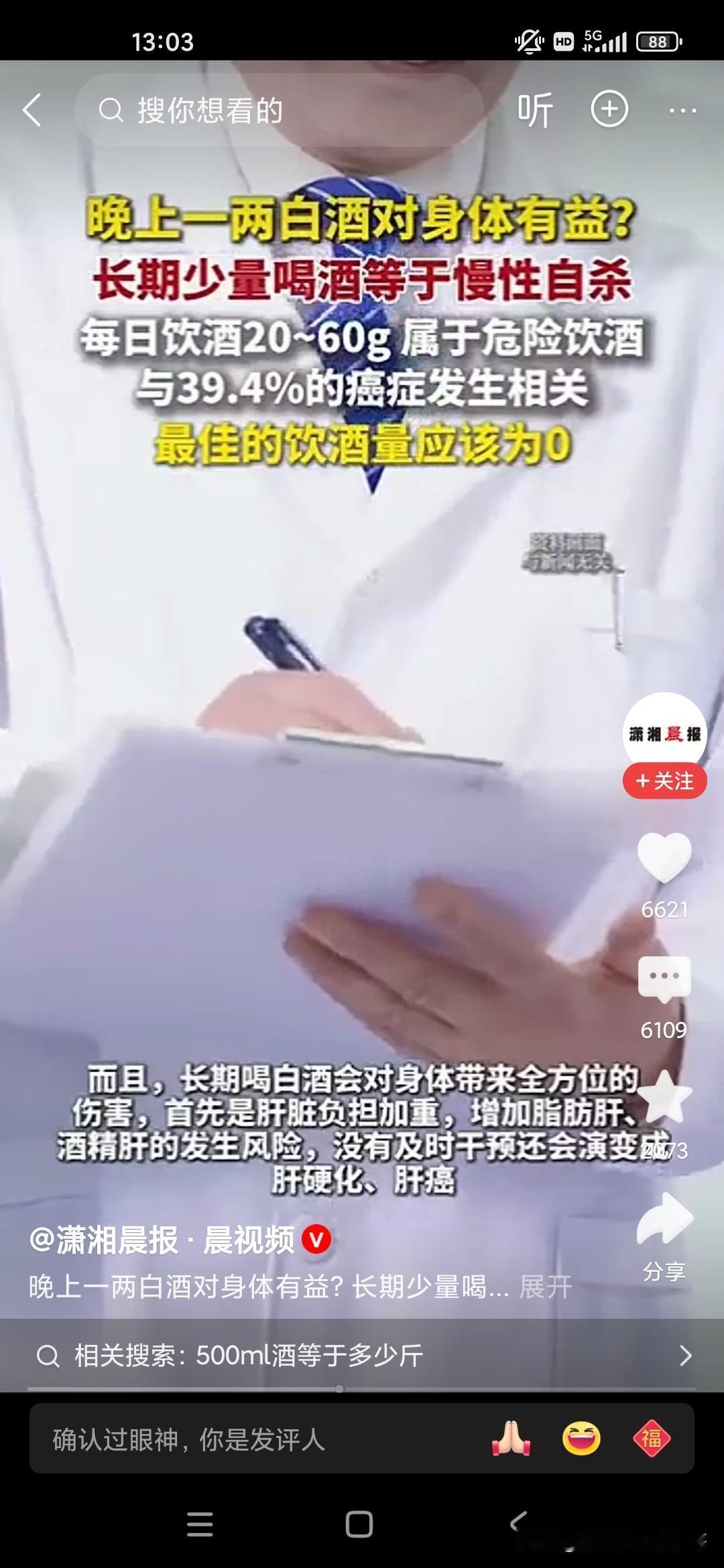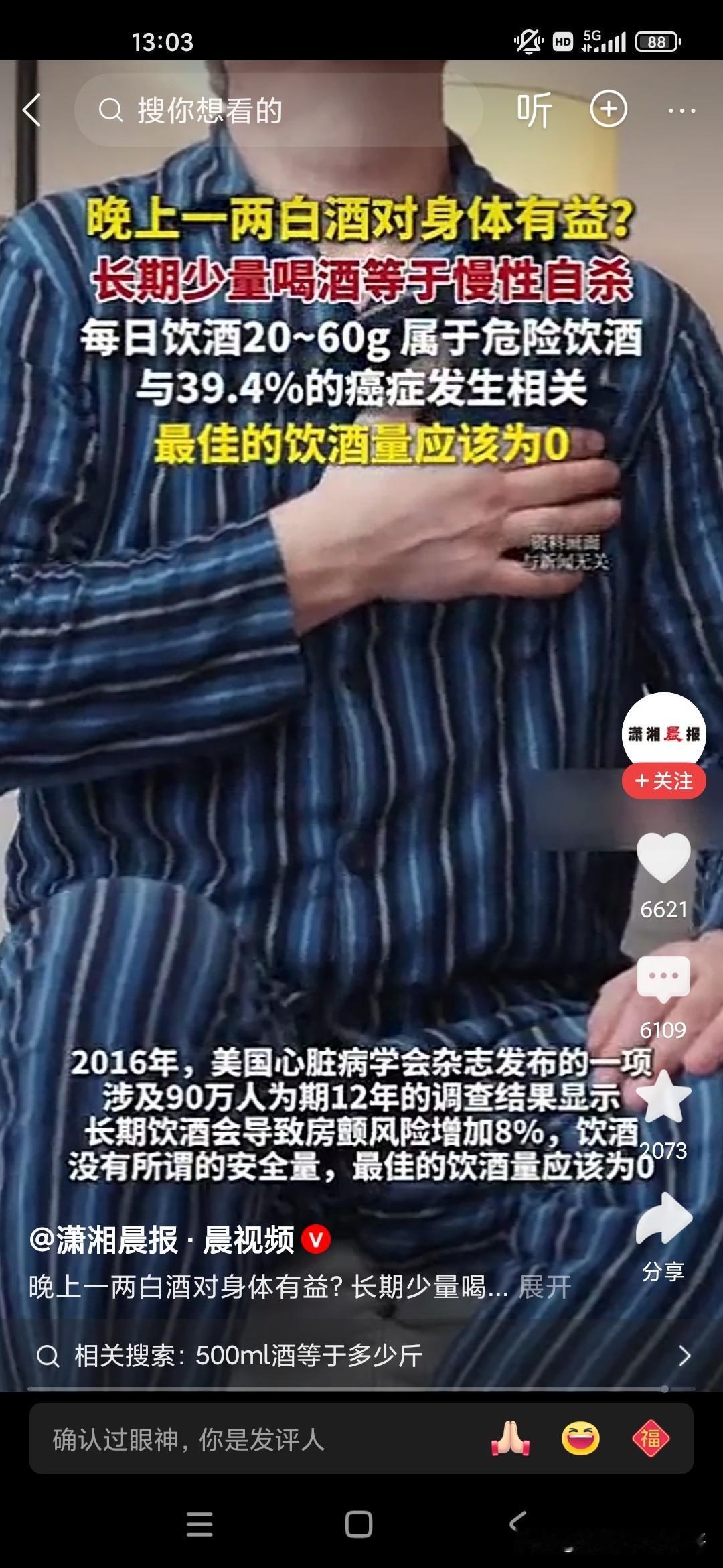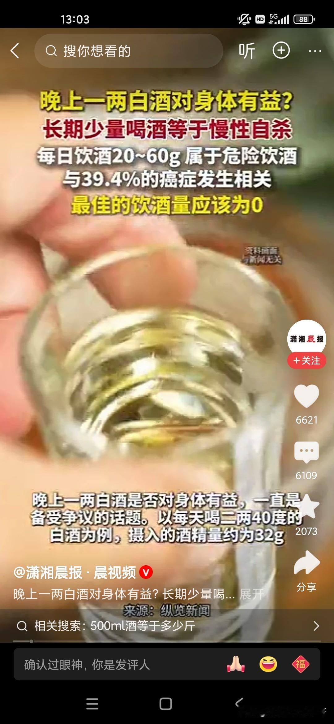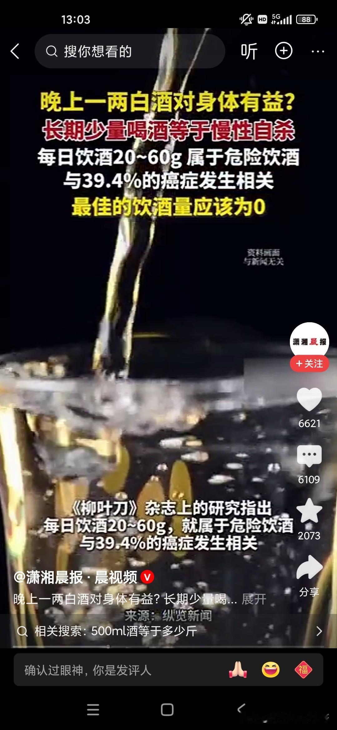 著名的医学杂志柳叶刀,经过多年的追踪研究,得出结论认为只要你喝酒就容易诱发癌症,无论你喝多少,最佳的推荐指数就是零,最好不要喝。 因为有的中国人会习惯性的每天喝个一二两,认为这样有助于养生和长寿,可以加速血液循环等等,我有时候也忍受不了夏天会喝啤酒,冬天会喝白酒,但是喝白酒居多吧,差不多每天都会喝个一二两,但今天听了他这个研究结果自己内心也的确有点儿担心和害怕,以后的话,这样逐步减少,甚至不喝,只有在逢年过节的时候可能会喝一点,这也打破了我以往的养生观念,因为以前的话,我都习惯性的每天晚睡之前会喝个一二两,有的时候甚至会多喝,我不知道大家怎么看这个事情!