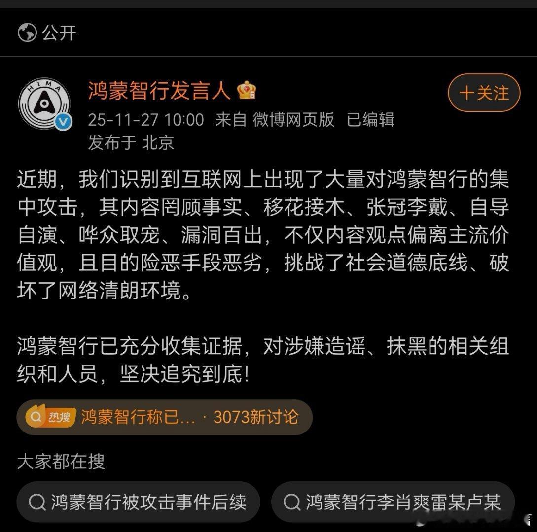 鸿蒙智行发文回应鸿蒙智行称已充分收集证据 对涉嫌造谣、抹黑的相关组织和人员坚决追