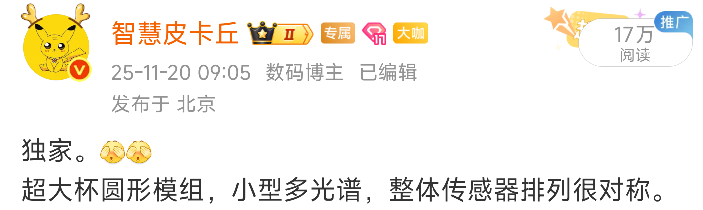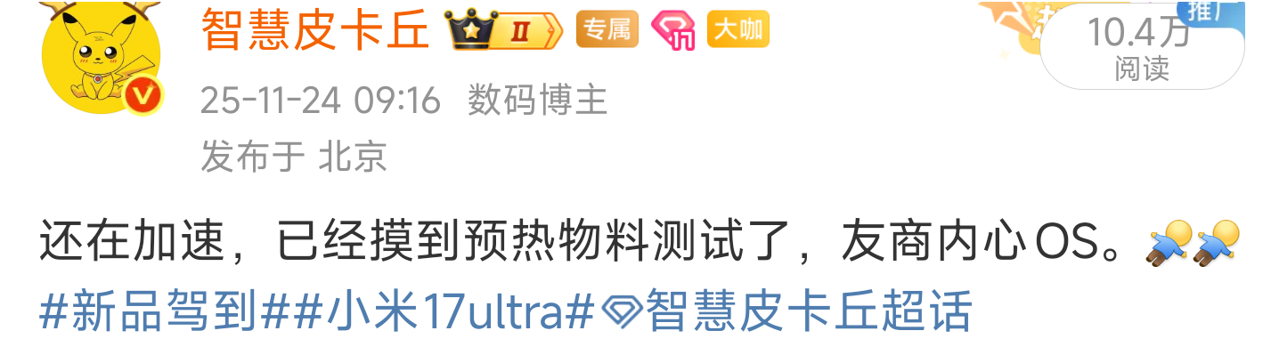 小米17Ultra这个对称设计大家觉得如何。还有一款小米最美智能手表,收窄边框,圆形旋钮,扁形下键,支持eSIM,微信手表版,可以联动灵动岛,UWB车钥匙,支持血管健康软检测,比运动表冠好看多了。年前超大杯空窗期,友商又要着急了。新品驾到小米17Ultra智慧皮卡丘