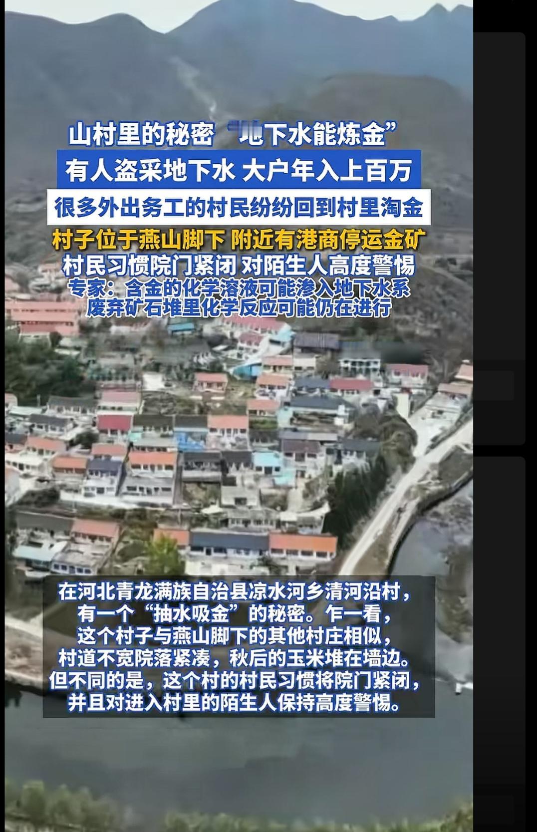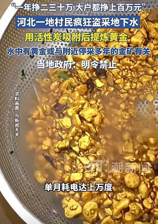 “太贪心了!”10月25日,在河北青龙县的一个村庄,部分村民发现抽取的地下水里含有细小的黄金颗粒。[给你小心心] 这些金子源自当地一座早已停产的老金矿,当年采矿时残留的金属物质,经过常年累月渗入了地下水中。 村民们使用大功率水泵日夜不停地抽水,通过简易的活性炭吸附方法来提取水中的黄金,这种方法耗电量巨大,有家庭每月用电量超过一万度,远远超出正常生活用电范围。 这种私自开采的行为带来了多重问题,大量抽取地下水导致水位明显下降,不少村民家里的水井都见了底,更严重的是提炼过程中含有重金属的废水被直接排入河道,造成了水体污染。 医疗检查发现,当地一些儿童出现了血液重金属超标的情况,这与水污染有直接关系,长期接触这些重金属,会对身体健康造成持续伤害。 关于河北一地村民疯狂盗采地下水,用活性炭吸附后提炼黄金的事件引起的不少网友的热议。 “河北青龙县这些村民为了淘金,把地下水都快抽干了河道也污染了,最后连孩子血液里都查出重金属超标,这简直是拿命换钱啊!” 有懂行的网友说,“这种土法炼金效率低得可怜,抽几十吨水可能都提炼不出几克金子,大部分黄金其实都随着废水又排回河里了,既浪费资源又污染环境,真是得不偿失。” “更可怕的是重金属污染的危害,铅、汞这些重金属在人体内会不断累积,对神经系统和肾脏的损害是不可逆的,孩子们正处在发育期,受影响更大,这可不是花钱就能治好那么简单。” 如果你们当地出现这种情况,你会怎么选择?是跟着一起淘金,还是举报这种破坏环境的行为?对于如何帮助这些村民在保护环境的前提下脱贫致富,你有什么好建议?欢迎在评论区分享你的看法! 信源:杭州网