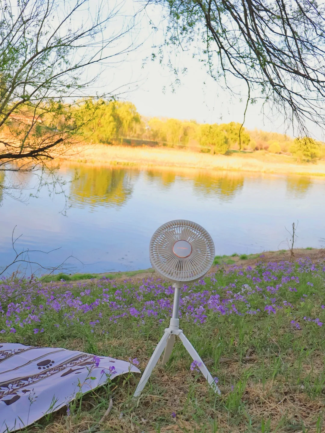可以支在地上或者放到桌子上、挂在帐篷⛺里,风力很大,几个人一起吹没问题,有七片扇叶,风很静音也不刮脸,关键很节能低档可以转一整天没问题