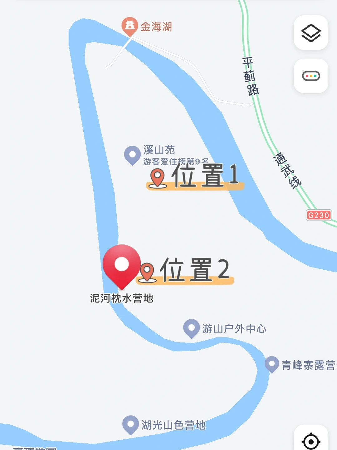 位置二📍泥河枕水营地,这里是瀑布水潭的位置,水比位置一清澈很多,可以下水游泳,水深一些,带小朋友注意安⚠️全