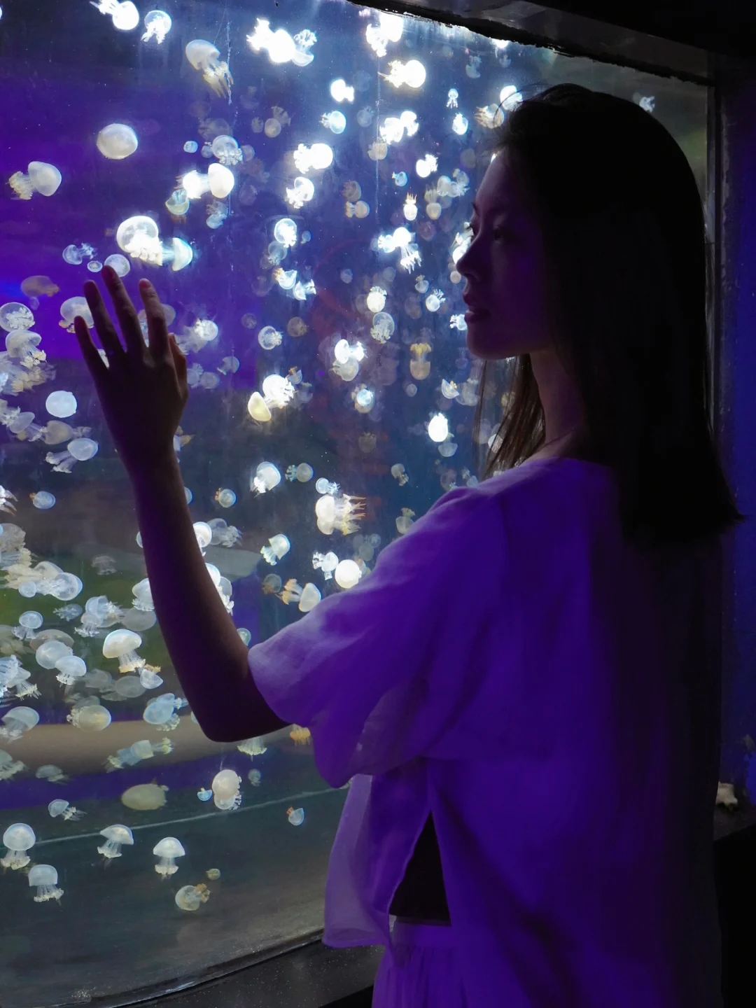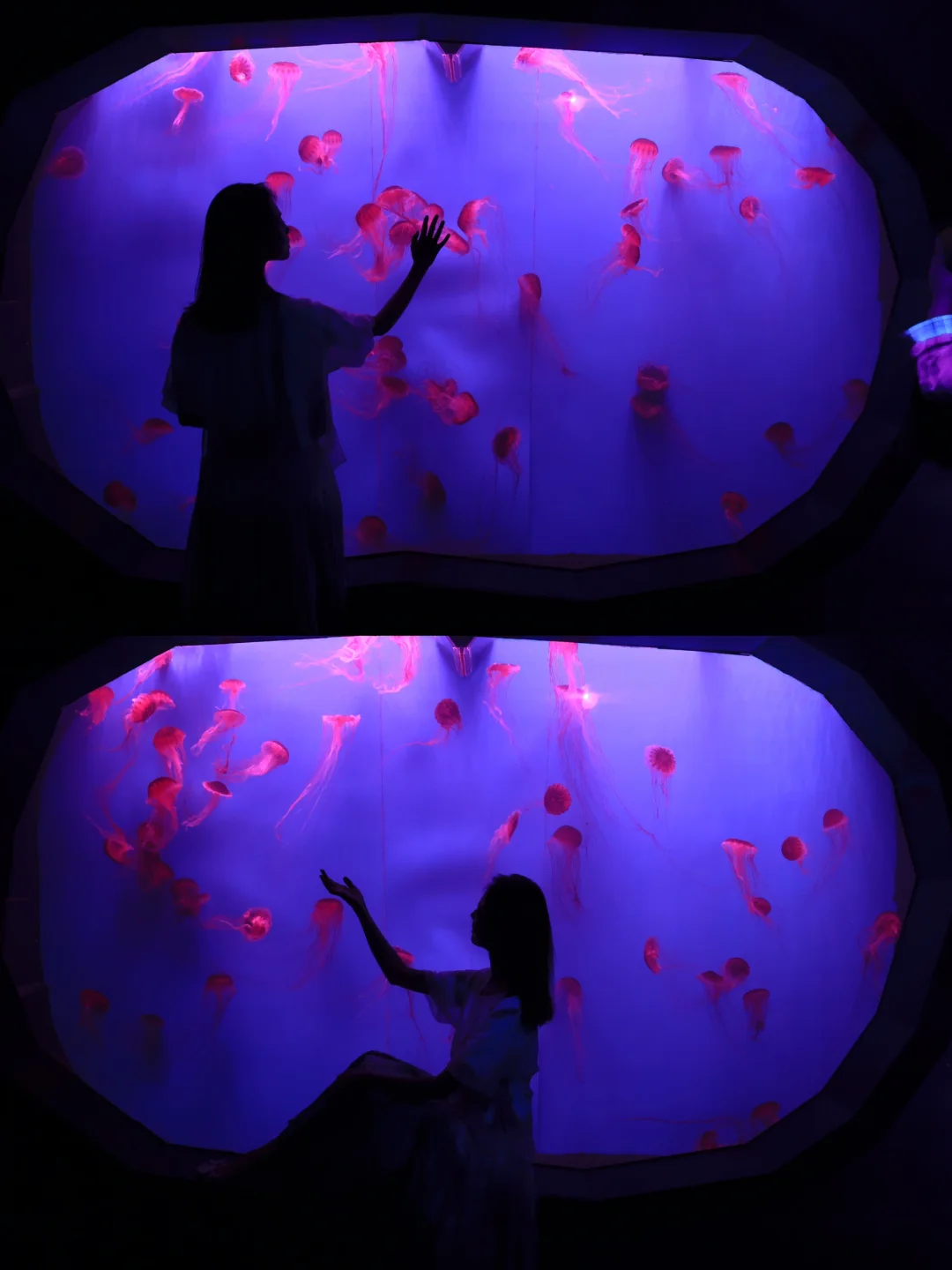 3️⃣动作:因为海洋馆一般比较黑,可以拍剪影,抬头看鱼,伸手摸玻璃和鱼互动,坐在鱼缸旁边拍大景,可以带耳机或者露营灯等道具,都很有氛围感
