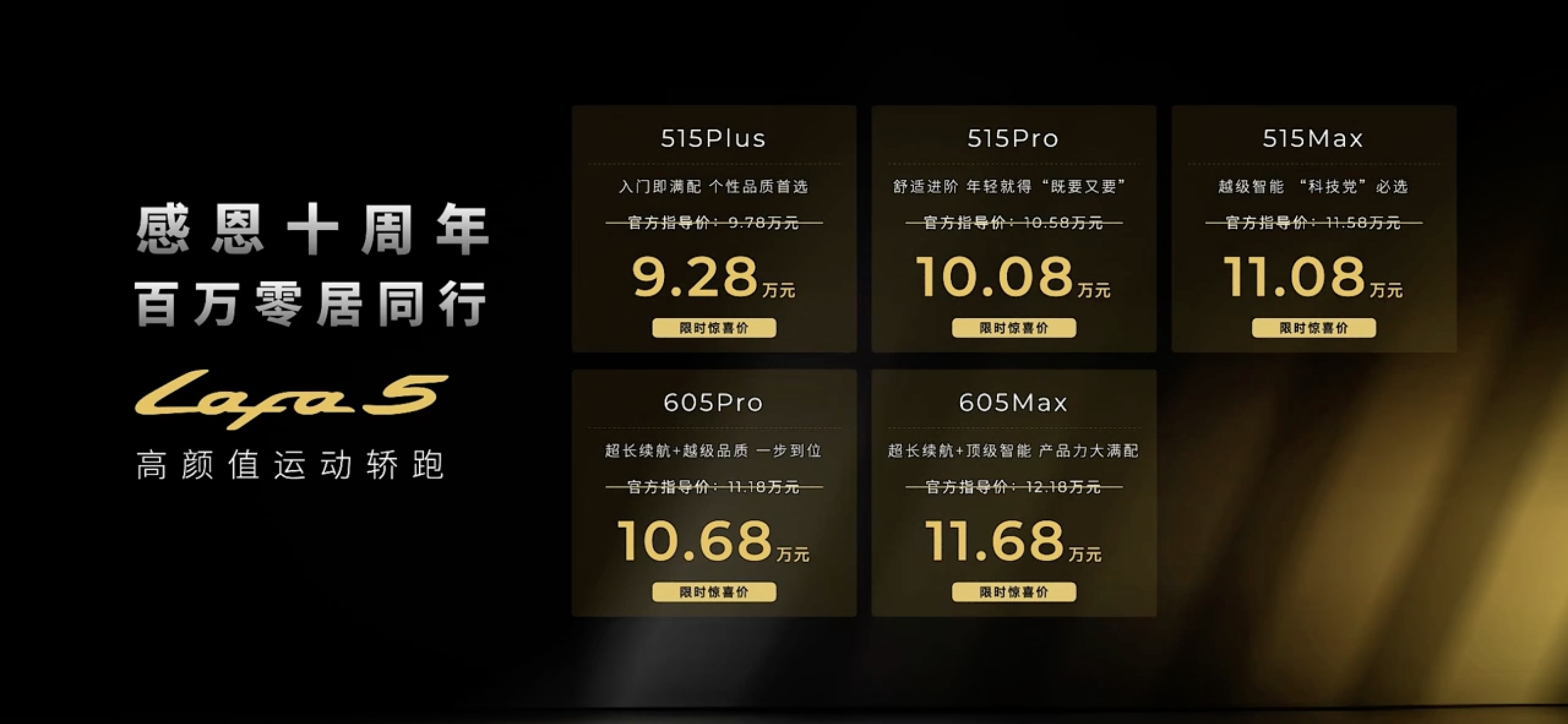 零跑Lafa5 已经上市,给大伙简单划一下重点~ 外观上,全系标配无框车门、纯平侧窗、还有6种车色可以选择。内饰上,搭载14.6英寸2.5K中控屏、支持通风加热的人体工学椅、Leap Sound 12扬声器。智能化方面,搭载Leapmotor Pilot组合驾驶辅助系统、Leapmotor OS 4.0 Plus交互系统。续航上,CLTC续航最高605km,补能从30%~80%最快18分钟。 新车售价9.28万元起,你喜欢吗?零跑Lafa5真的很懂年轻人高颜值运动轿跑自己定义路