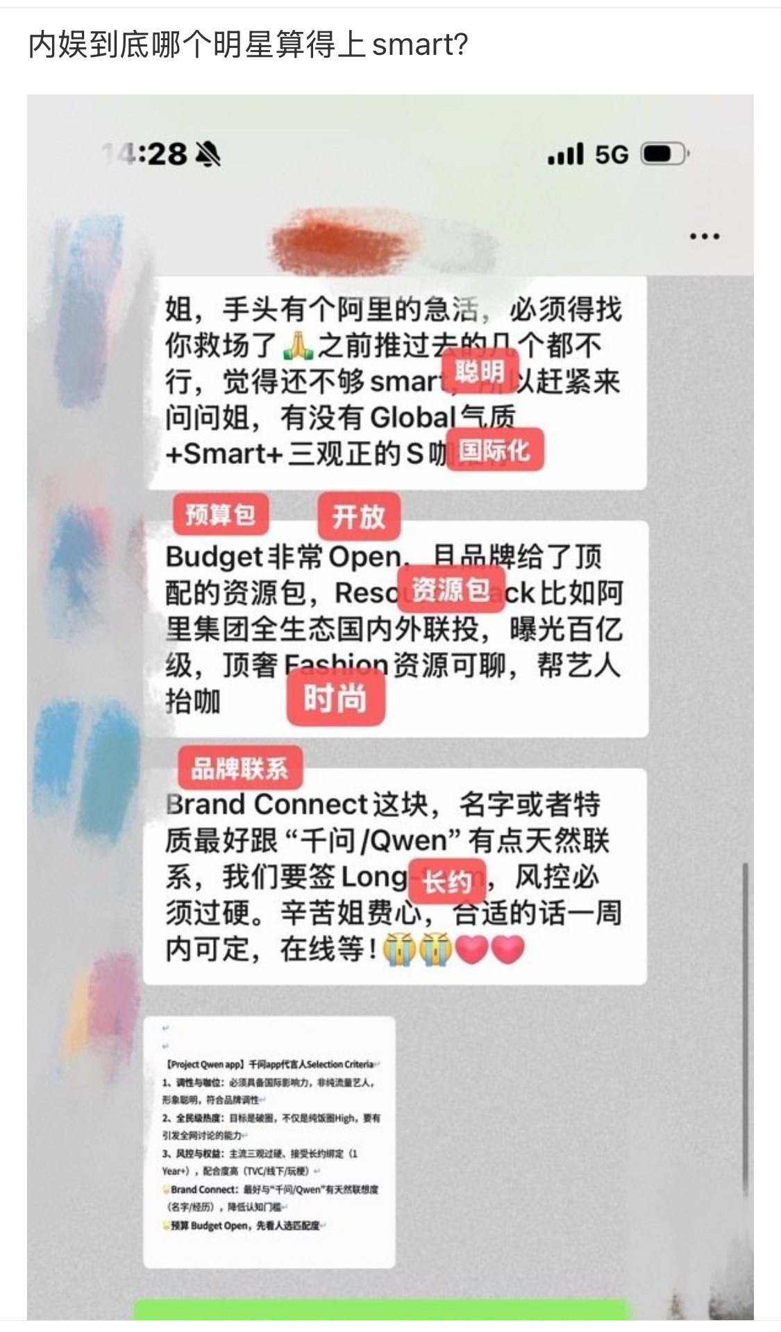 网传阿里千问在找明星代言人,从爆料内容来看,该明星需要足够smart。我真的要被这个需求笑死,千问升级后,用的是阿里最强的Qwen大模型,确实比以前更聪明懂思考,品牌应该是想找一个形象相匹的代言人。但关键是聪明标准有很多,学历够高?还是情商够高,还是荧幕形象是聪明的就行?千问回应代言人要求