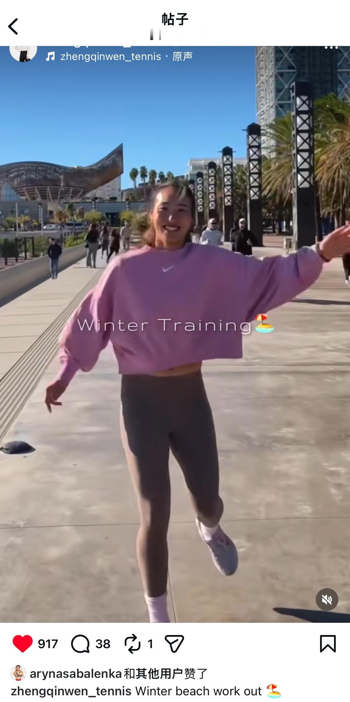 萨巴伦卡5G冲浪点赞郑钦文晒冬训视频