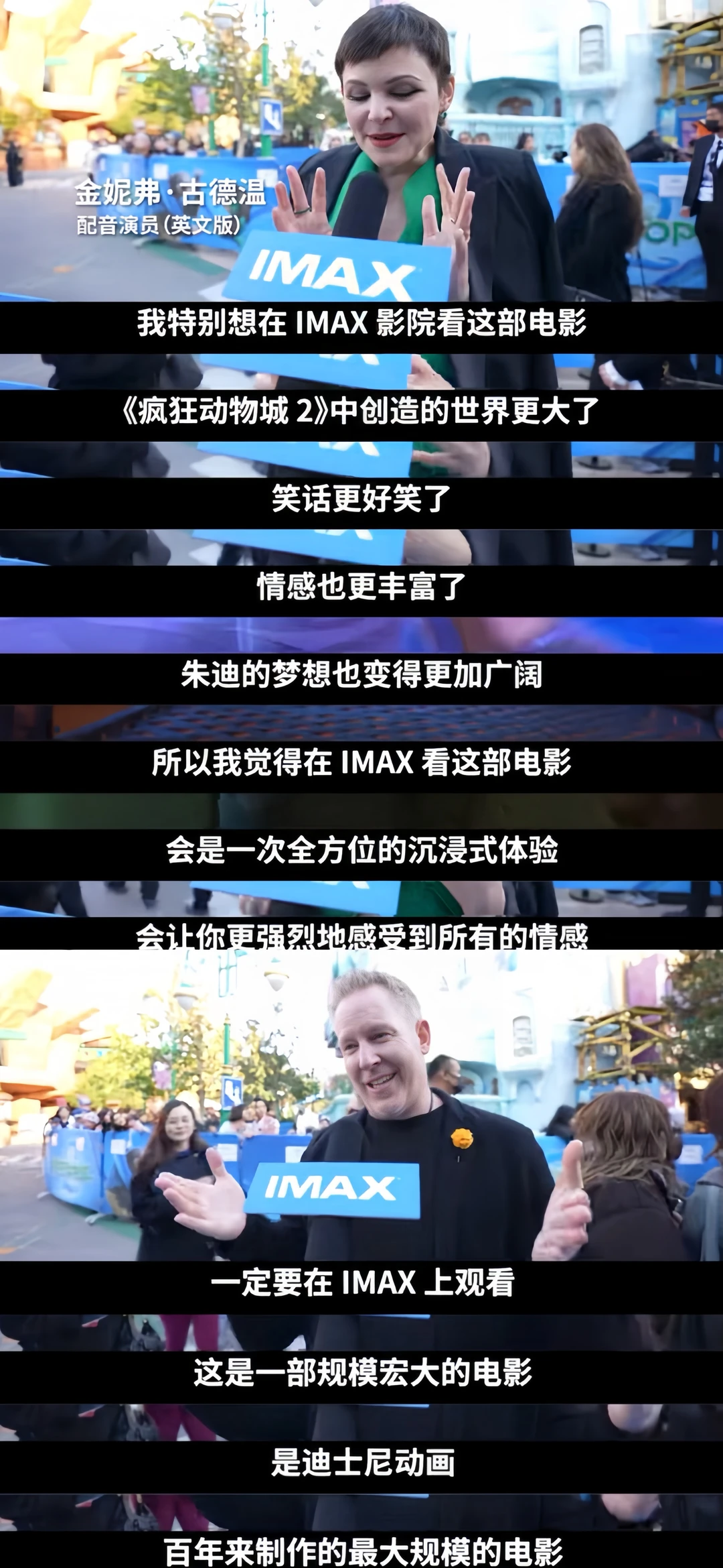 ”英文版配音演员金妮弗·古德温也认为,在IMAX看《疯狂动物城2》会是一次全方位的沉浸体验,“会让你更强烈地感受到所有的情感”。