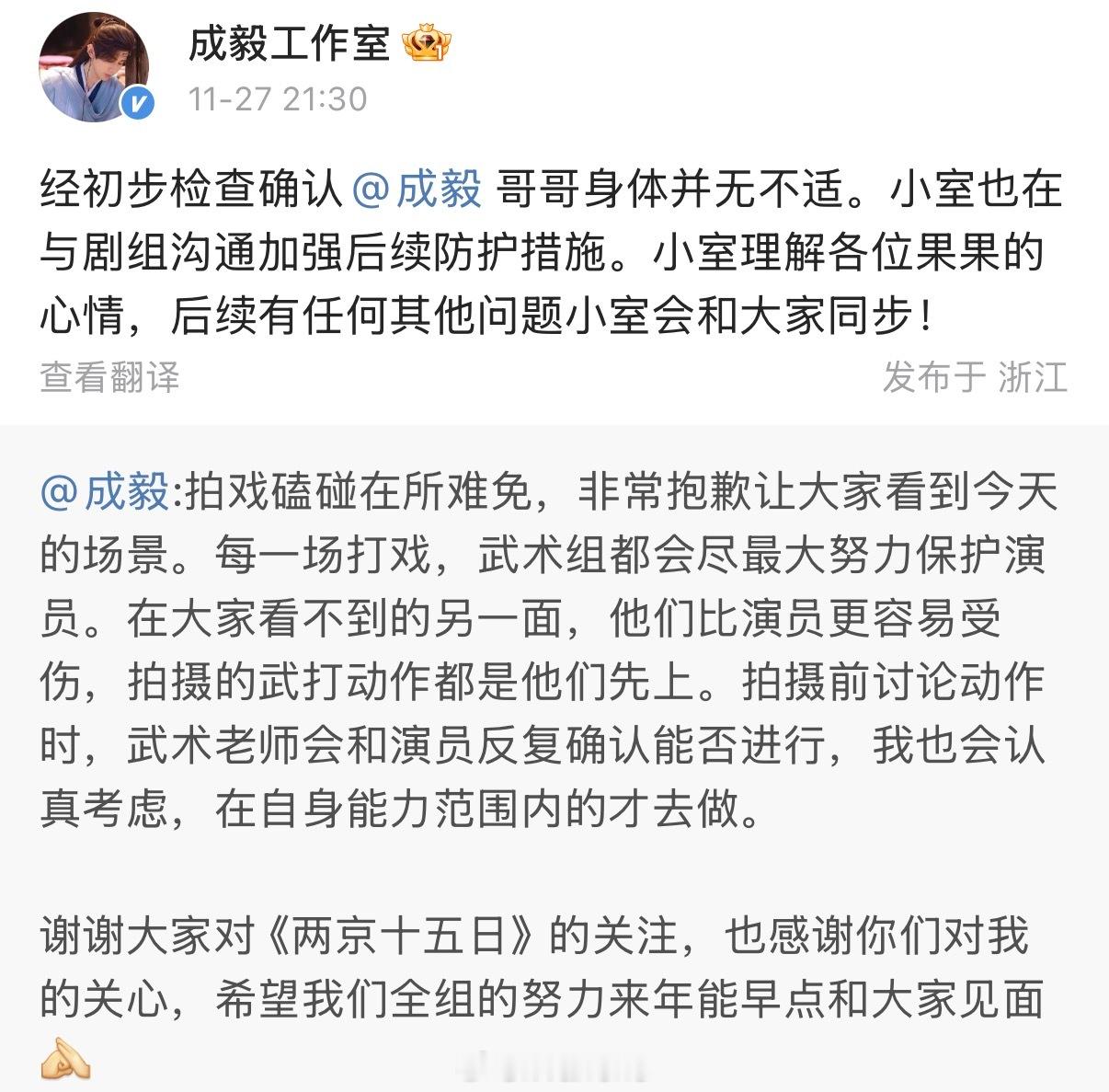 成毅工作室发文回应称成毅初步检查身体了并无不适;还称在与两京十五日剧组沟通加强后续防护措施了……成毅回应两京十五日拍摄受伤