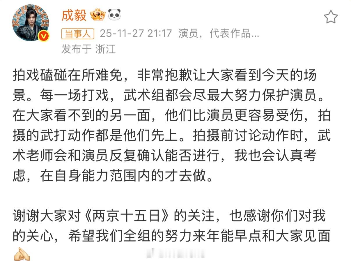 成毅发文回应了:拍戏磕碰在所难免,非常抱歉让大家看到今天的场景……成毅体面人呀!成毅回应两京十五日拍摄受伤成毅又受伤了