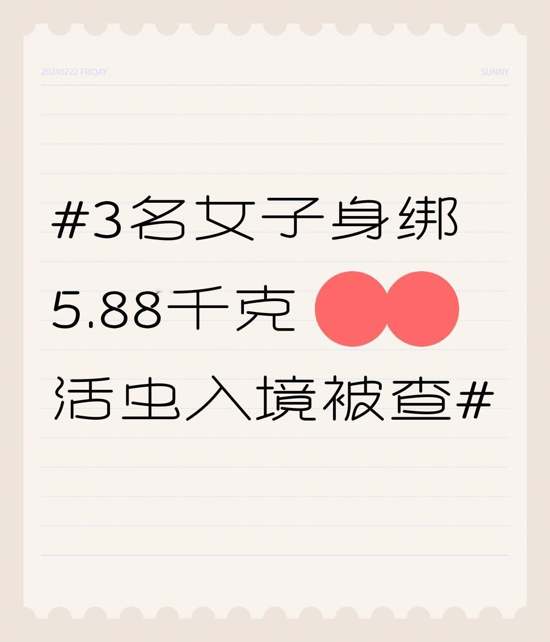 3名女子身绑5.88千克活虫入境被查 近日,昆明海关所属西双版纳海关查获一起惊人事件。3名女子竟在腹部夹藏5.88千克活竹虫试图入境。当时,海关关员在勐龙通道旅检监管现场查验时,发现这3名连续入境的旅客腹部位置异常,经检查,发现是用塑料袋包裹的活竹虫。 千万别小看这些活竹虫,依据相关名录,昆虫等活体动物禁止携带进境。不知这3名女子为何非要以身试法,夹带如此多的活虫。海关有着敏锐的洞察力,想蒙混过关可没那么容易。大家还是要遵守规定,切勿进行这种冒险行为。