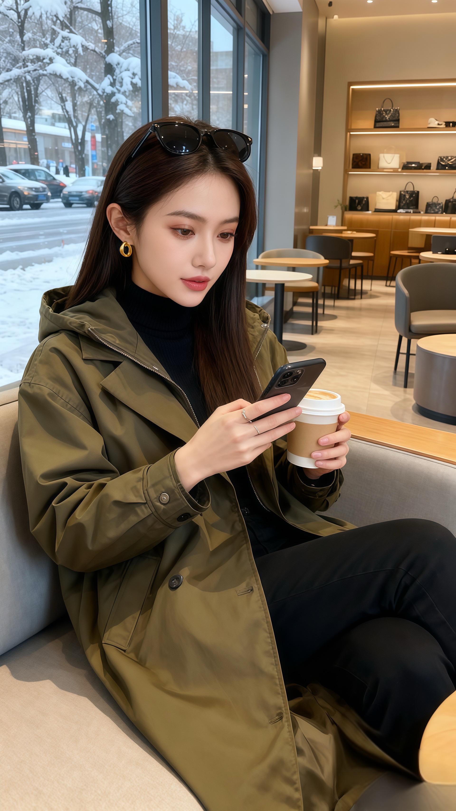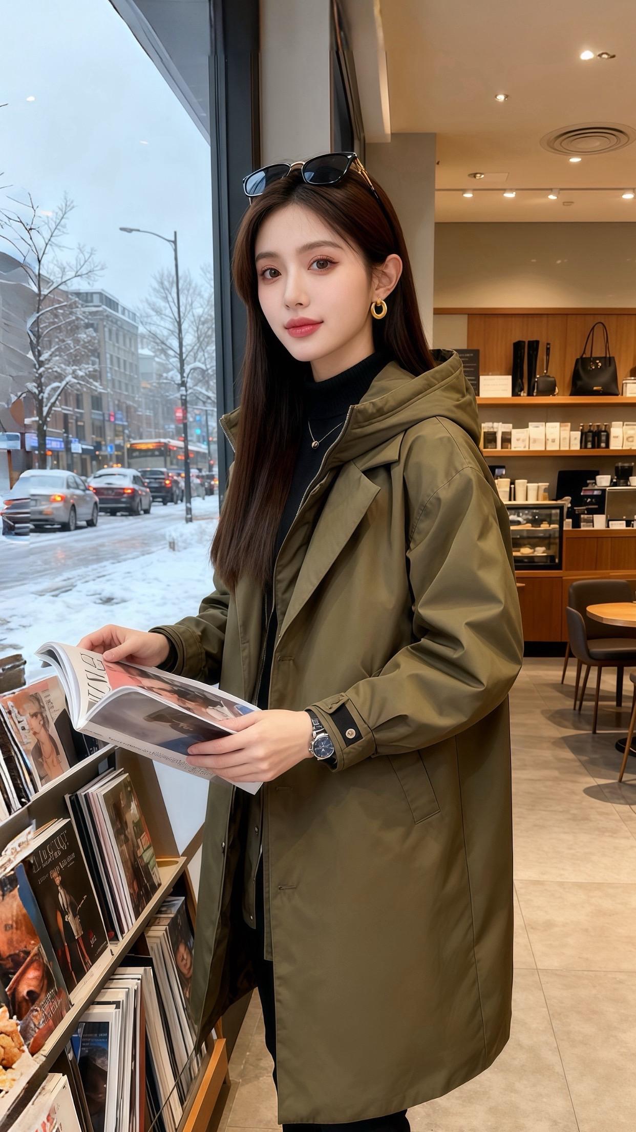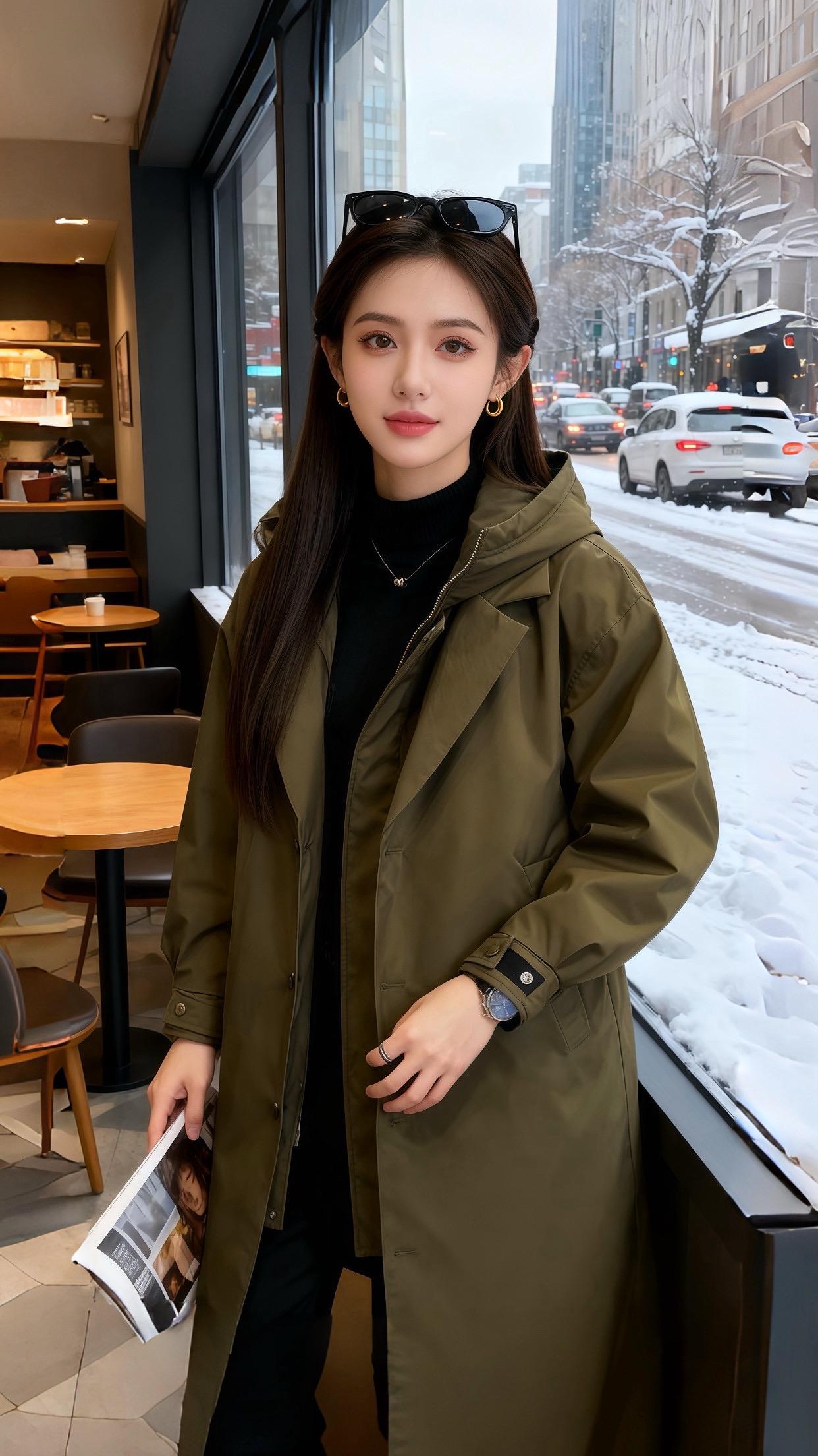雪落满街的午后,她裹着橄榄绿风衣推门进来时,连咖啡店的暖光都柔和了几分。