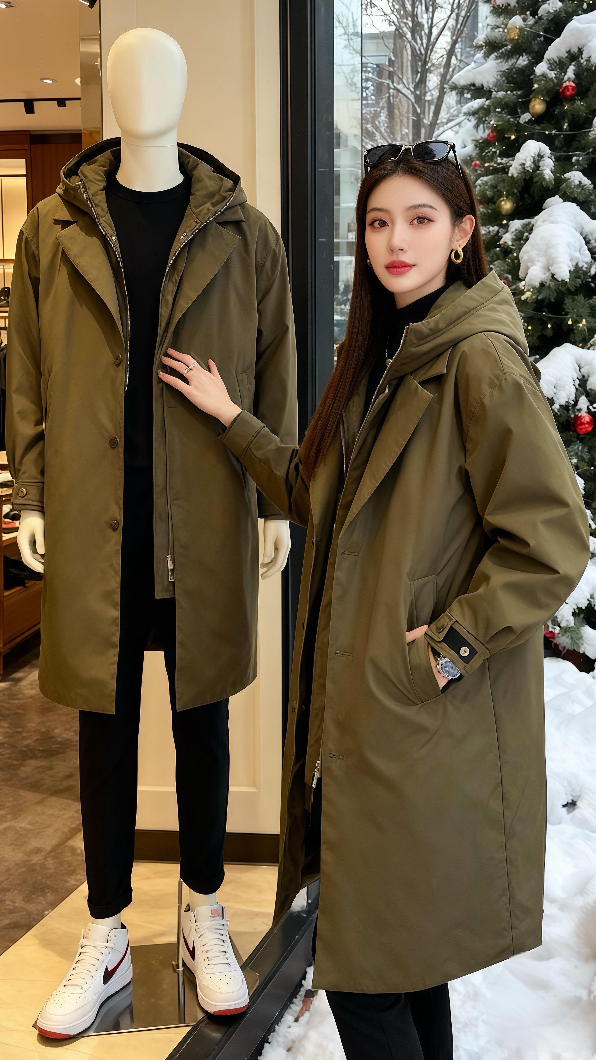 风衣是松垮的廓形,衬得她肩线清瘦,连帽边垂落的弧度都恰好,袖口那粒暗扣让单调的袖管多了点细巧心思。内搭的黑高领贴得脖颈温软,项链细链在领口露半寸光,像冬夜里没说透的话。