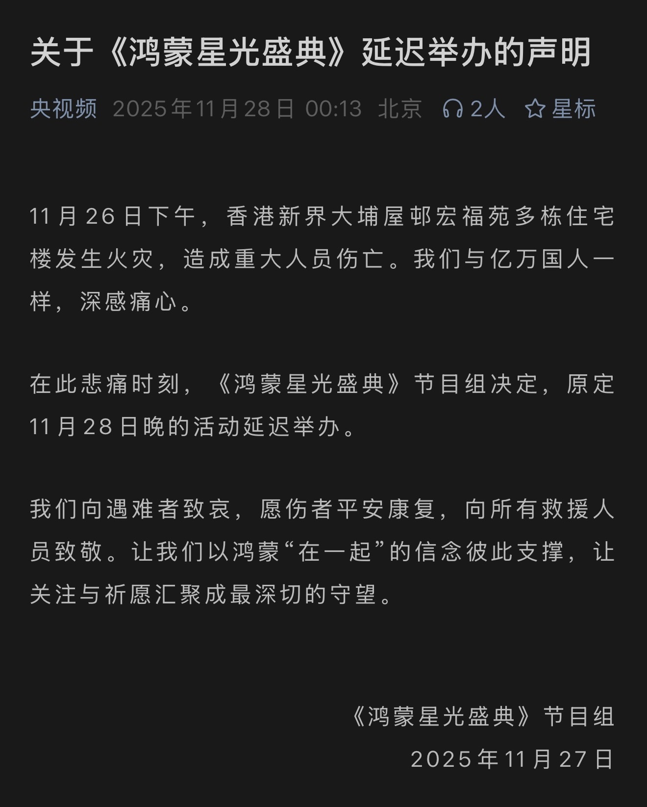刚刚接到通知,本来要去鸿蒙星光盛典的,但是因为香港火灾,延期举办了。惊了!华为真有魄力啊,准备了这么久,请了这么多明星。 这个没得黑!
