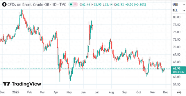 受这些因素影响,国际油价近期持续面临下行压力。目前,布伦特原油期货价格接近每桶63美元,美国WTI原油价格则不足每桶60美元。