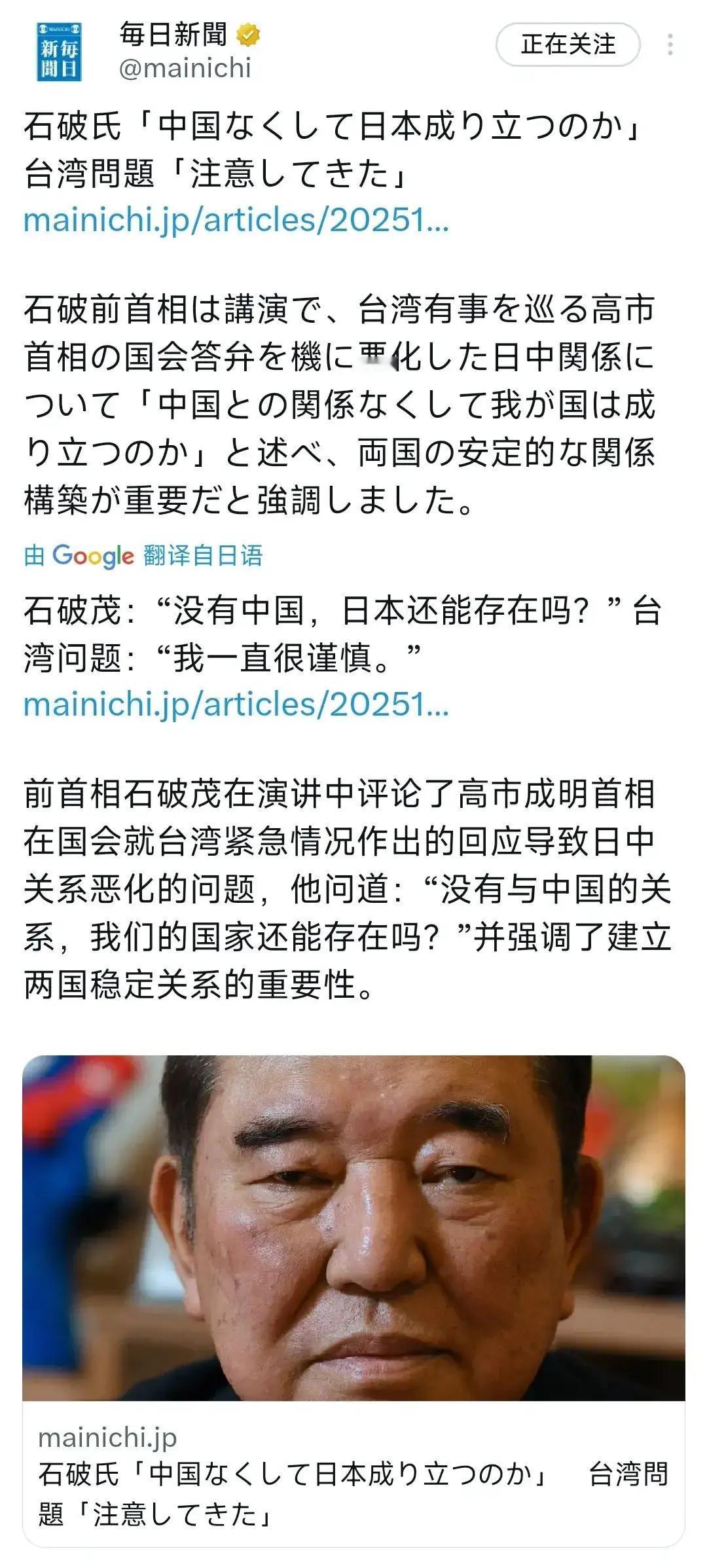 石破茂:没有中国,日本还能存在吗? 日本《每日新闻》11月26日报道:“石破茂:“没有中国,日本还能存在吗?台湾问题:我一直很谨慎”。日本前首相石破茂在演讲中评论了高市早苗首相在国会就台湾紧急情况作出的回应导致日中关系恶化的问题,他问道:“没有中国的关系,我们的国家还能存在吗?并强调了建立两国稳定关系的重要性”。 最近日本政坛这两种截然不同的声音,真是戳中了现实的要害。石破茂这句话不是危言耸听,而是把最实际的问题摆到了台面上——日本的生存,真的离得开中国吗? 先看经济层面。日本的汽车、电子产业,一半以上的海外市场都在中国。去年本田在中国卖了137万辆车,占全球销量近三分之一;索尼的相机、游戏机,中国消费者也是主力军。要是中日关系彻底闹僵,这些企业的订单直接腰斩,工厂裁员、工人失业是必然的。再看老百姓的日常,日本超市里的蔬菜、水果,三分之一来自中国;连便利店的饭团原料,都有不少是从中国进口的。断了这些供应,普通日本人的生活成本得涨多少? 再对比高市早苗的言论,“台湾有事就是日本有事,暗示可武力介入”。这话简直是在玩火。台湾是中国内政,跟日本有啥关系?鸠山由纪夫说得明白,她就是想制造危机感,好给日本扩军找借口。最近日本军费连涨,2024年预算突破7万亿日元,创历史新高,这不就是借台湾问题当幌子吗? 但高市早苗没算清楚账:中国现在的实力,可不是几十年前。要是真敢武力介入台湾,中国的反制绝对是毁灭性的。别说经济合作断了,连日本本土的安全都可能受威胁。石破茂的理性,就是看清了这点——邻居之间,合则两利,斗则俱伤。 其实,不管日本政客怎么折腾,台湾属于中国的事实永远变不了。石破茂的话是给日本敲警钟:别跟着激进派瞎闹,务实才是对国家负责。高市早苗那种玩火行为,最后只会引火烧身。大家觉得,日本接下来会选哪条路?是跟着石破茂的理性走,还是被激进派带偏?这不仅影响中日关系,更关乎东亚和平。咱们普通人虽然管不了别国政治,但也能看明白谁在做对的事,谁在犯糊涂。毕竟,稳定的邻居关系,对谁都好。
