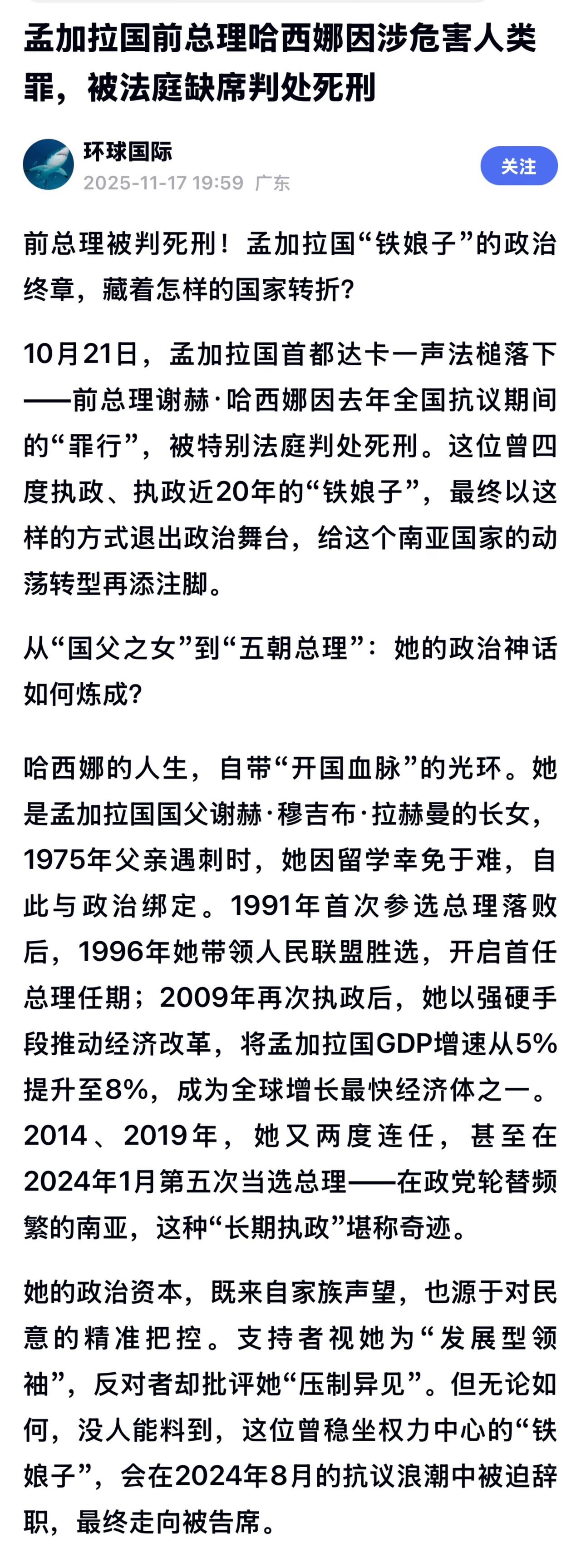 孟加拉前总理哈西娜贪污罪成 判监21年 据报道,法官马蒙11月27日裁定,哈西娜的行为“表明她根深蒂固的贪污心态,这种心态源于她自以为是、滥用权力以及对公共财产的贪婪”。法官也指出:“她将公共土地视为私人资产,贪婪地觊觎国家资源,并操纵官方程序,为自己和近亲谋取私利。” 不过,公诉人称将针对判决提出上诉。 去年8月,学生领导起义反对哈西娜的独裁统治,促使哈西娜搭乘直升机逃离孟加拉,目前居住在印度。现年78岁的她声称,所有指控偏颇不实,而且出于政治动机,因此拒绝遵从法院命令回国受审。 此前,孟加拉法院裁定,哈西娜去年在学生起义中实施血腥镇压,因触犯反人类罪而被判处死刑。另外,反腐败委员会也对她提起三项指控,指她在首都达卡郊区非法侵占利润丰厚的土地。 现居美国的哈西娜儿子瓦泽德,以及曾任联合国高级官员的女儿瓦泽德也各被判五年监禁。 联合国称,在哈西娜早前实施镇压行动,导致多达1400人丧生。