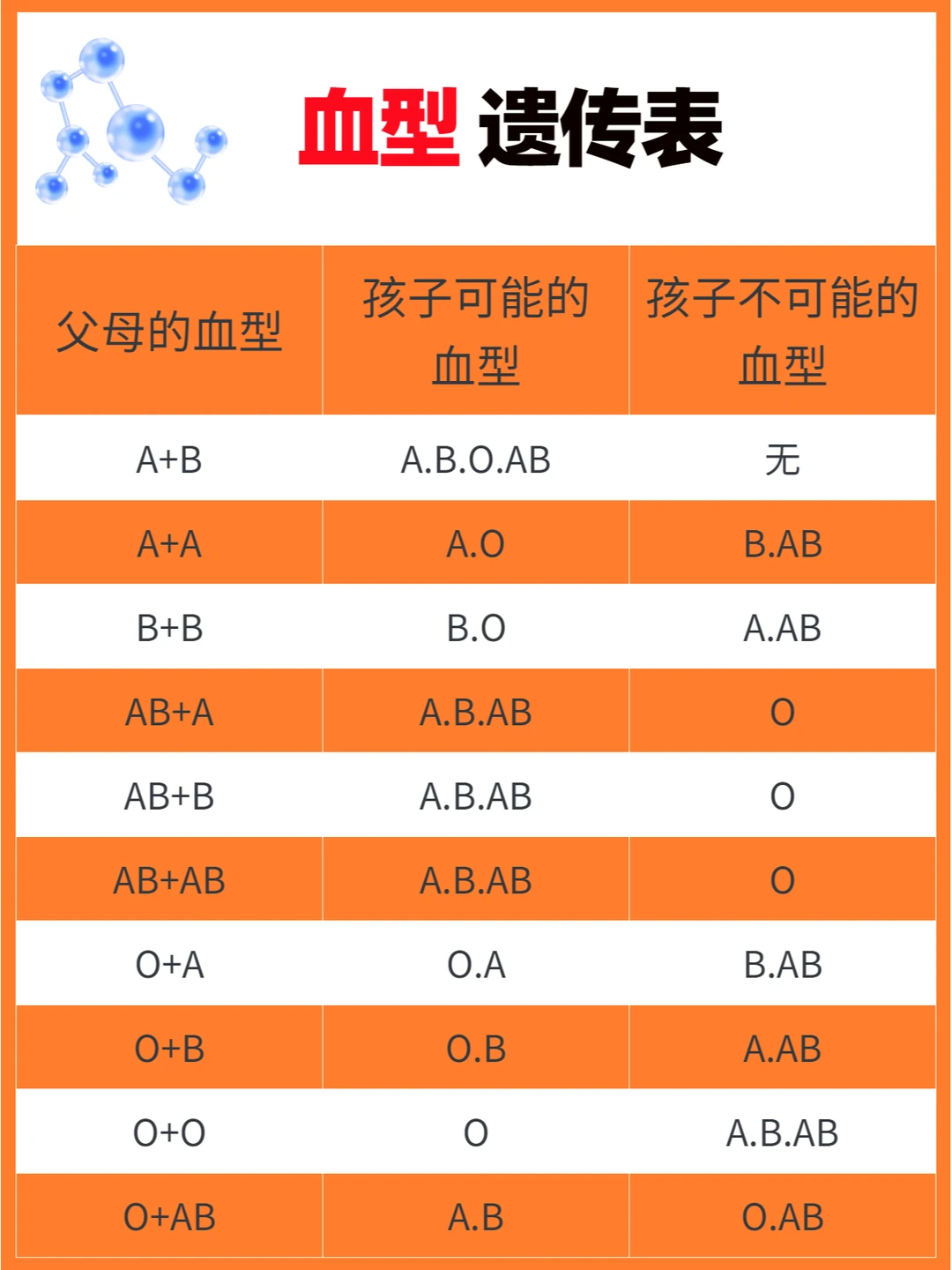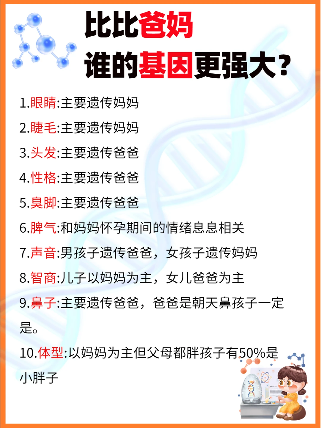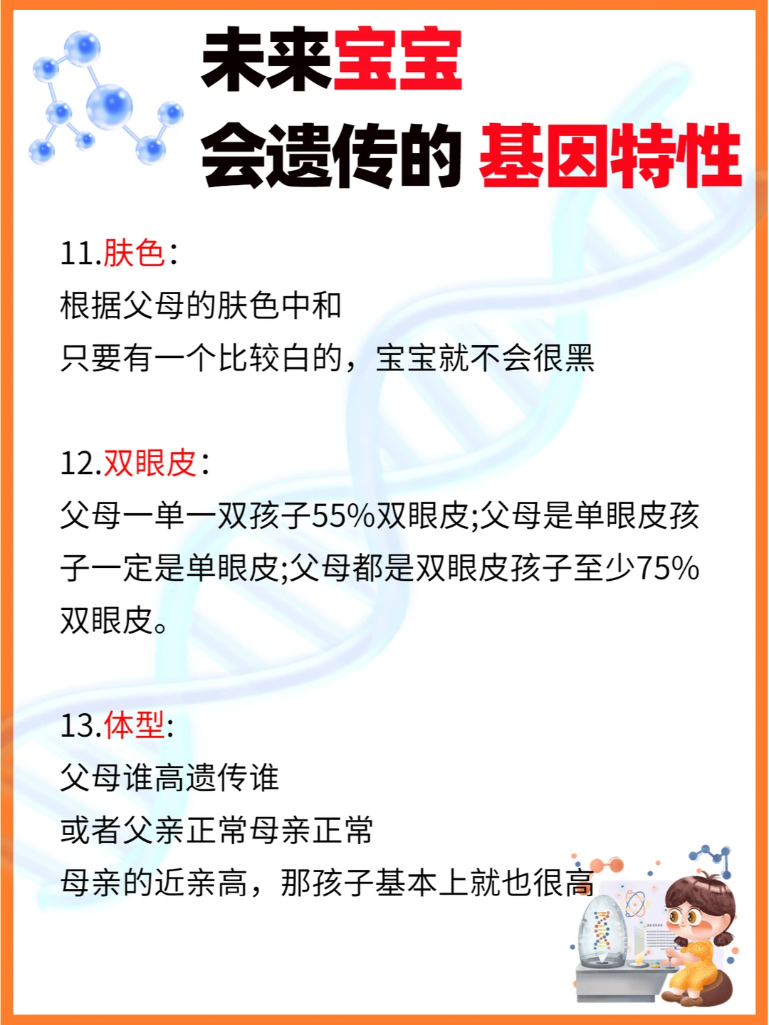 图文中父母的13种遗传基因分别能遗传到孩子多少,