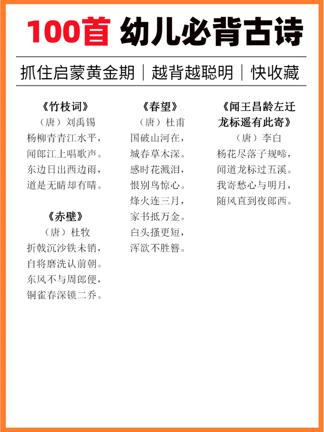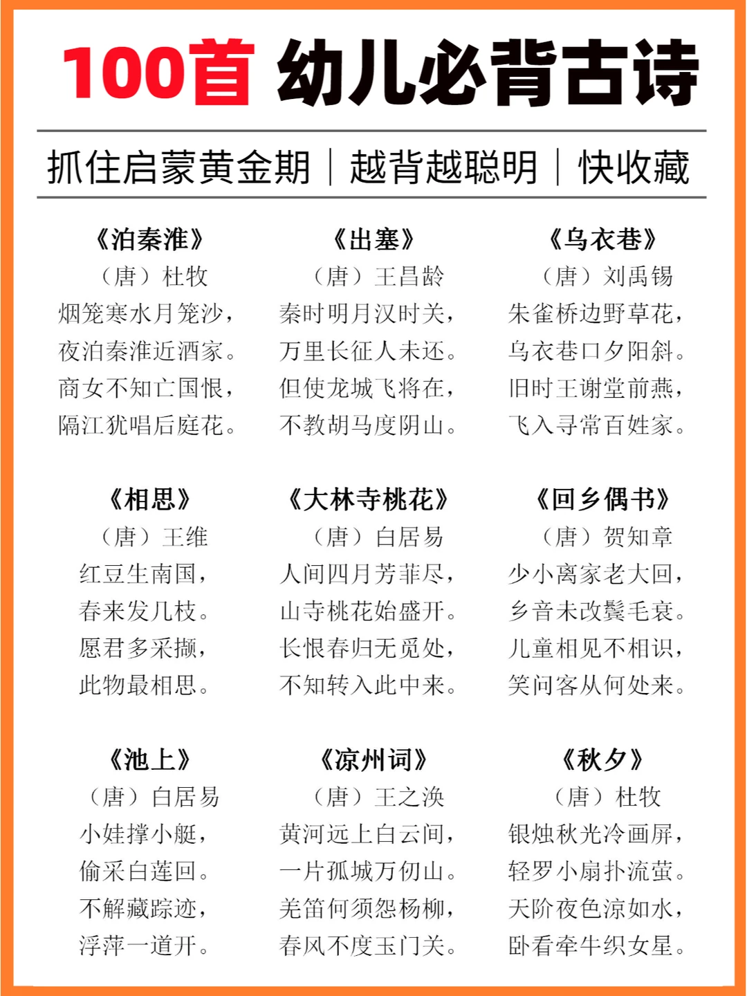 2岁开始,宝宝就进入语言发展的黄金期,抓住这个机遇,不用强迫死记硬背,多听这些基础和经典的古诗词,潜移默化,宝宝就能随口记住、出口成章,作为以后的知识储备, 背古诗好处多多!