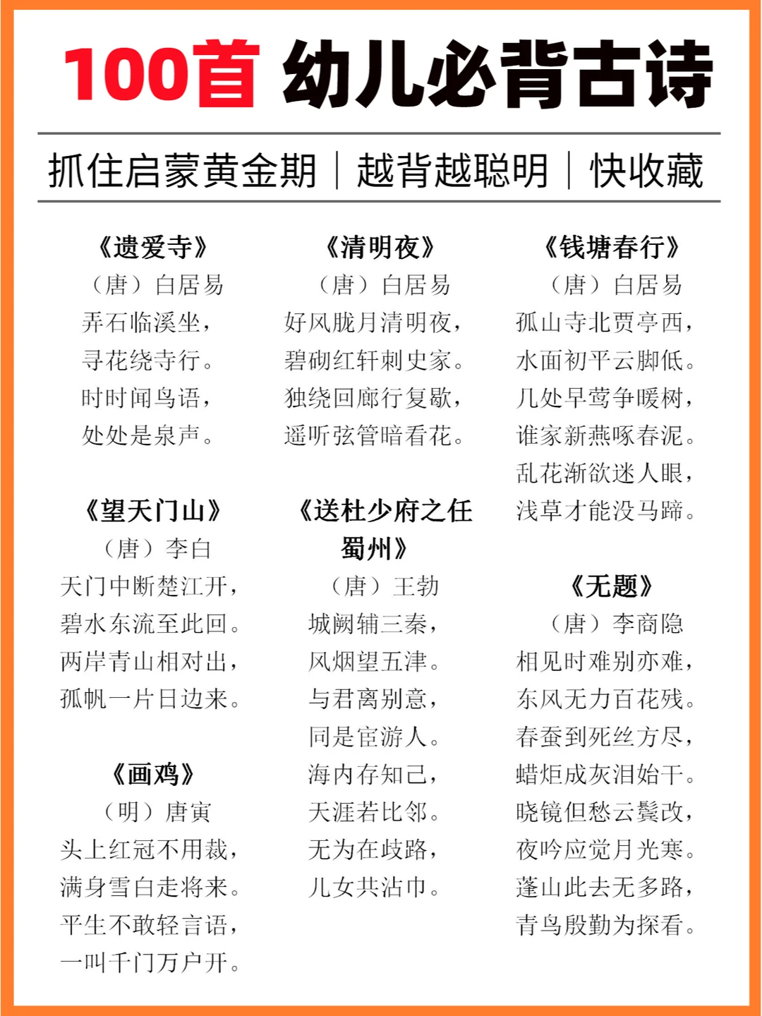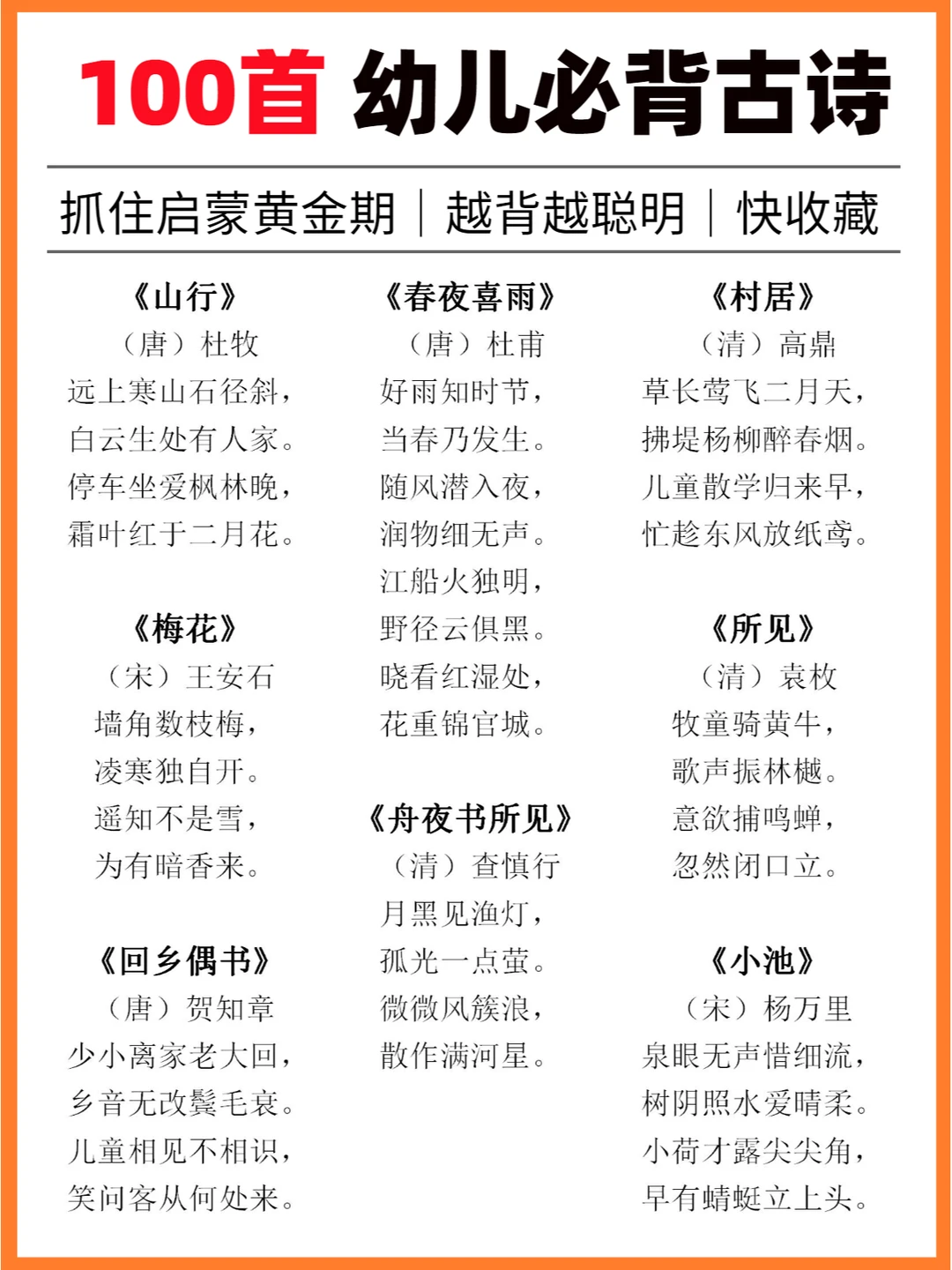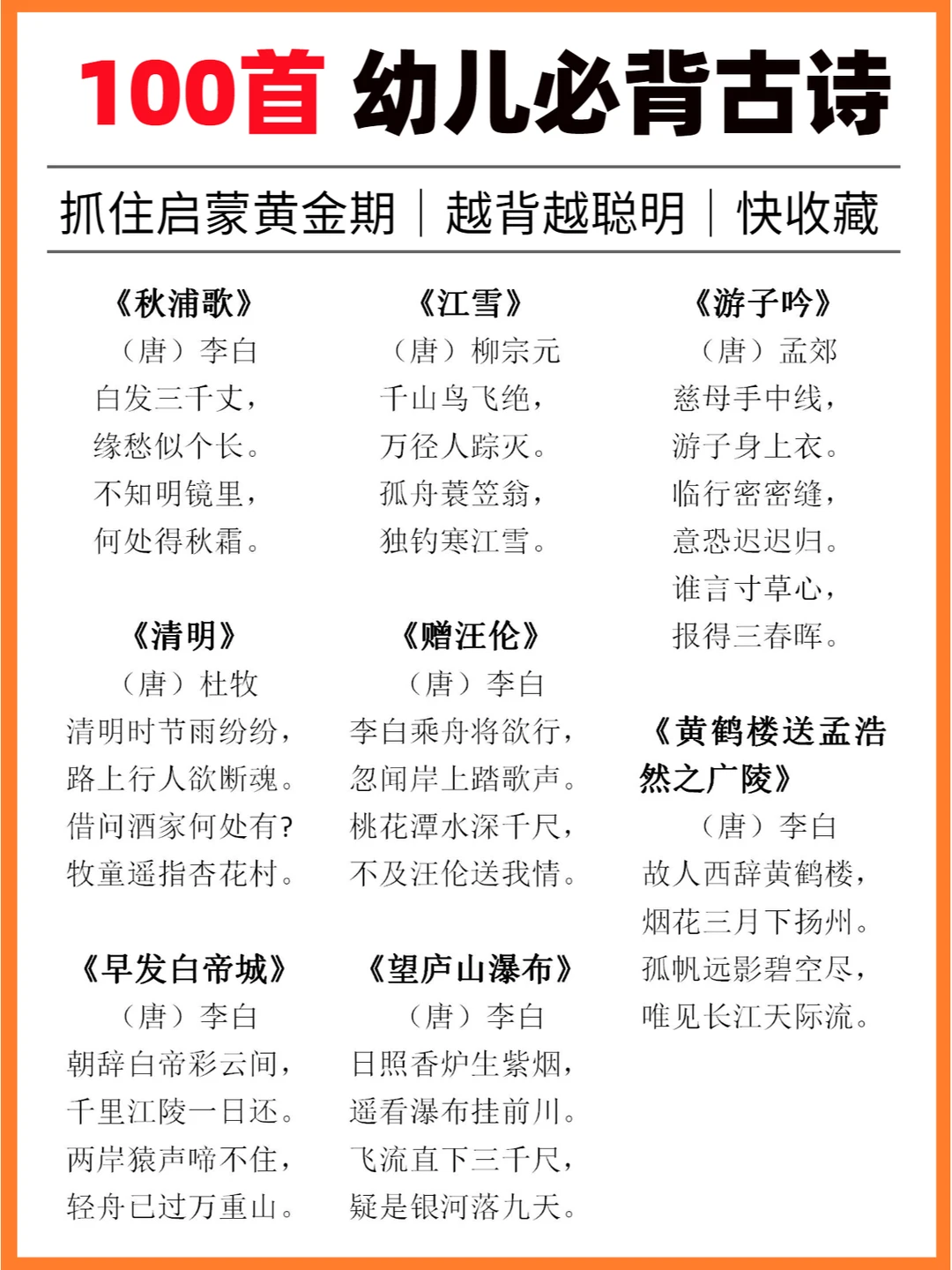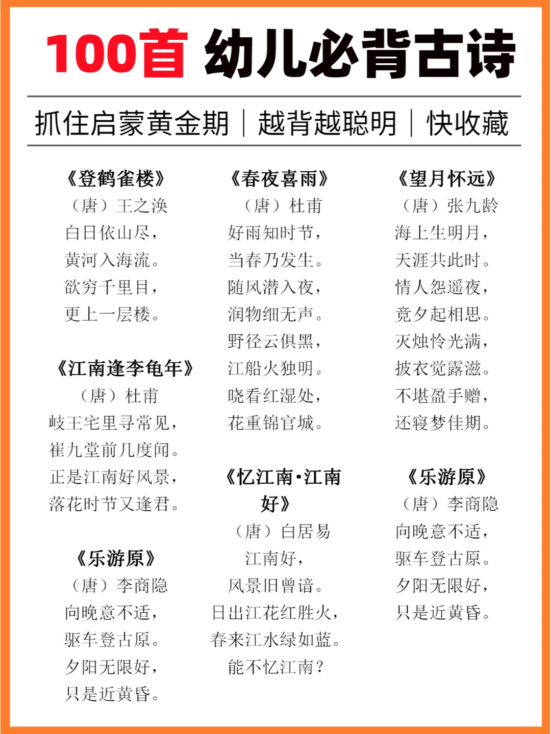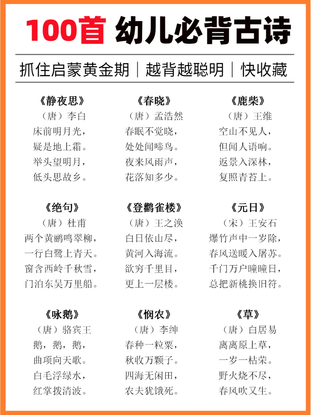 幼儿园小朋友的必背的古诗词整理好啦,多听、多读不仅能激发宝宝的语言表达能力,还能启蒙宝宝的国学知识。