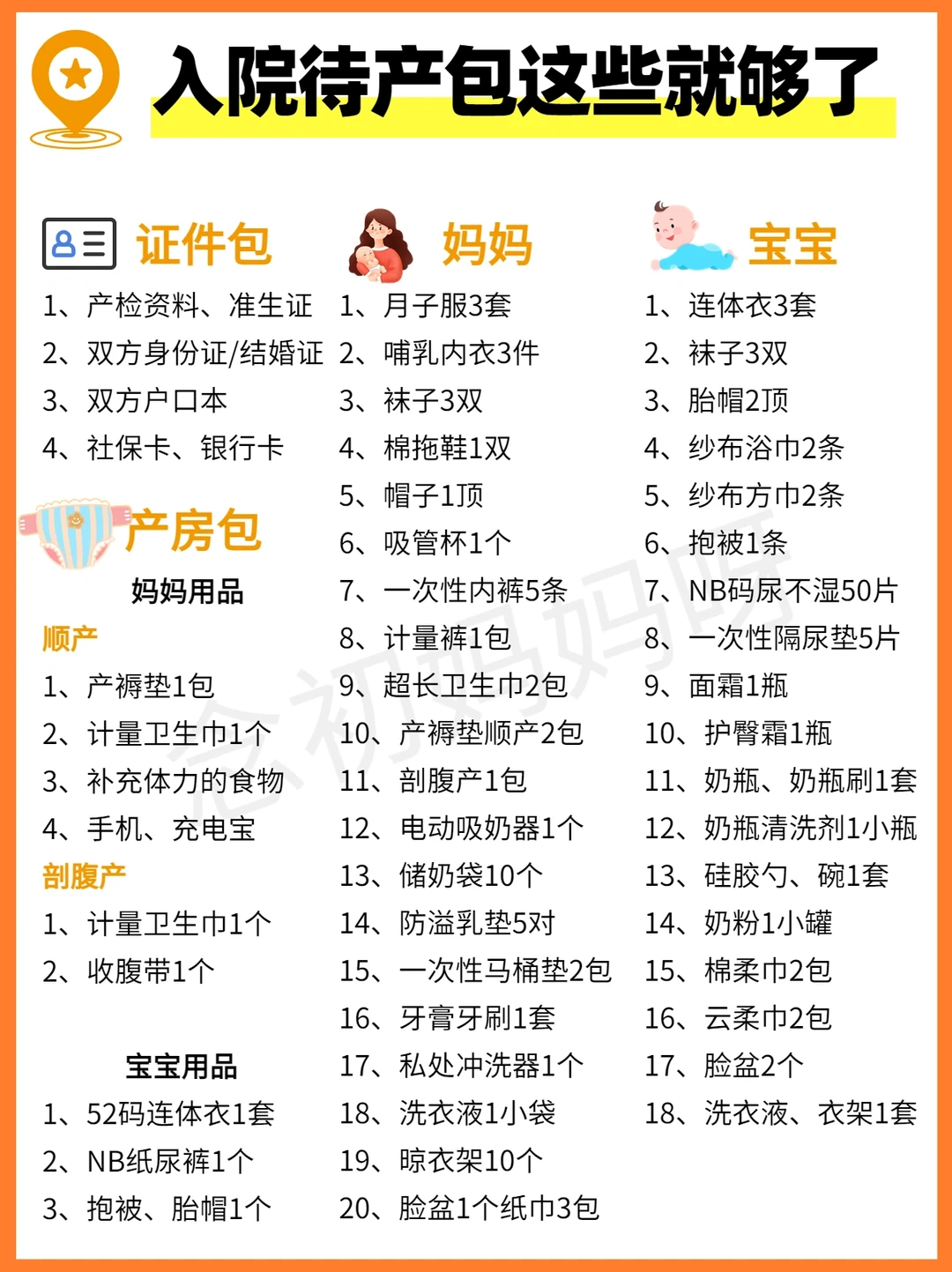孕期准备待产包看得眼花缭乱,这些东西到底是做什么用?哪些是必须准备的?哪些鸡肋?希望帮助到新手妈妈们。 . 💛住院待产包要带的东西都在图5,分为证件包、产房包、住院包 剖腹产和顺产要带去产房的物品有点区别,大家按需准备就行 孕36周就要收拾好,也可以选择比较全的待产包,这样缺什么再补就可以了,很省事!