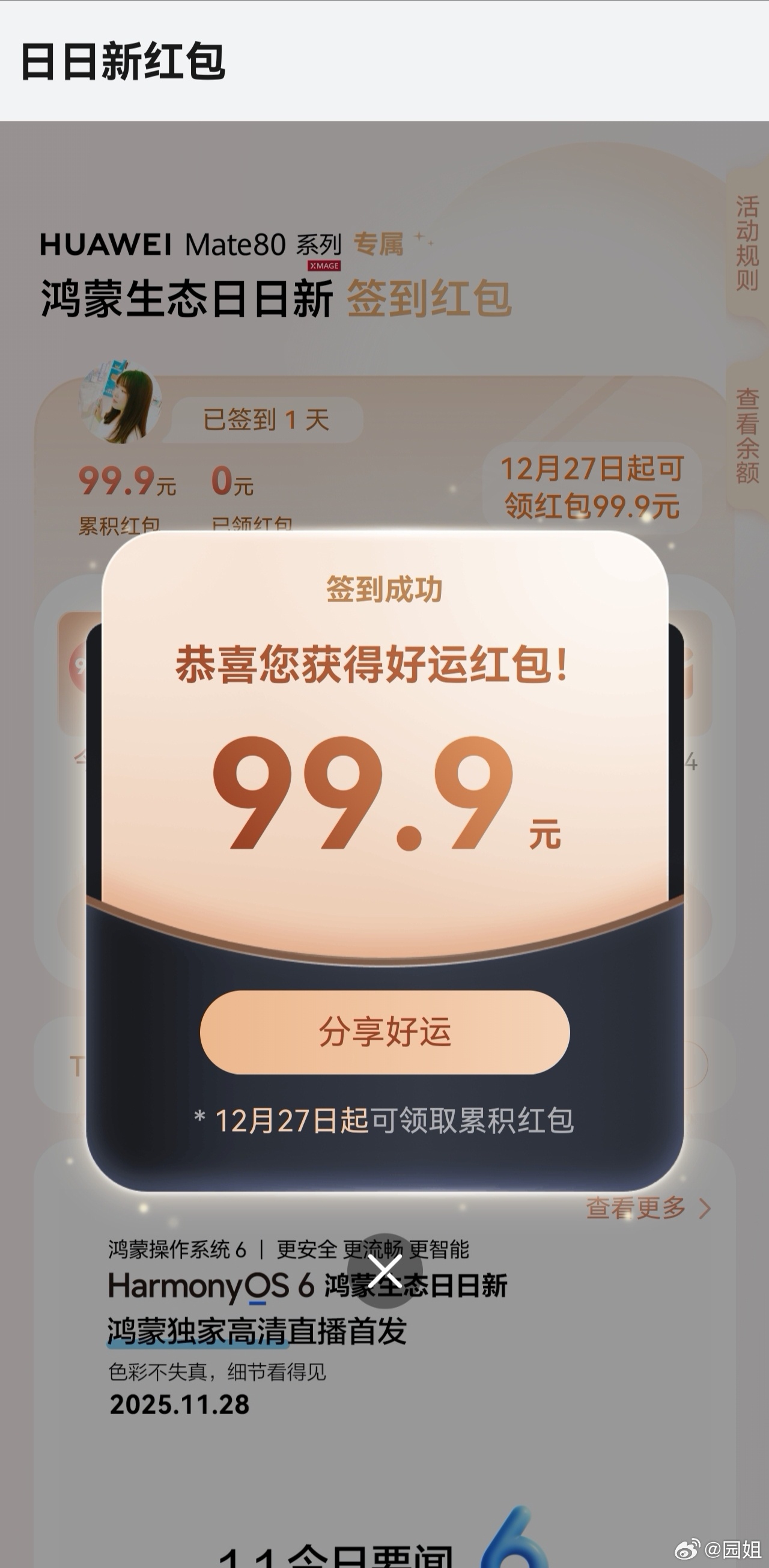 拿到华为新机第一件事就是领日日新红包,每天都可以领,我今天领了99.9,这个金额还行吧