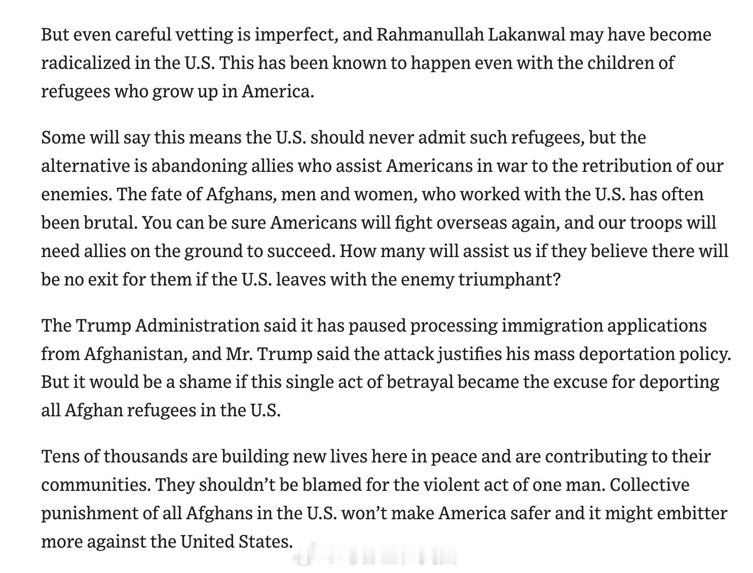 关于国民警卫队成员遭阿富汗移民袭击的社论文章:“尽管审查再严格也不可能万无一失,Rahmanullah Lakanwal 很可能是在来了美国之后才被激进化的。在美国长大的难民子女里,也曾出现过类似的情况。有些人会说,这就证明美国根本不应该接收这些难民。可另一种做法,就是把在战场上帮助过美国人的盟友丢给敌人去报复。很多曾和美军合作的阿富汗人,不论男女,后来下场都很惨。可以肯定的是,美国以后还会在海外打仗,美军也还需要当地盟友撑腰。要是大家都觉得:美国一旦撤军、敌军占上风,他们就会被彻底抛弃,那又有多少人愿意帮我们?川普政府表示,已经暂停处理来自阿富汗的移民申请,川普本人也说,这次袭击证明他的“大规模驱逐”政策是合理的。但如果因为这一件背叛行为,就拿来当理由,把在美国的所有阿富汗难民都赶走,那就太可惜了。现在有成千上万的阿富汗人在这里安稳生活,为社区出力,他们不该替某个人的暴力行为背锅。把所有在美阿富汗人一概惩罚,不会让美国更安全,反而可能让更多人对美国心生怨恨。”今日焦点海外新鲜事热点现场