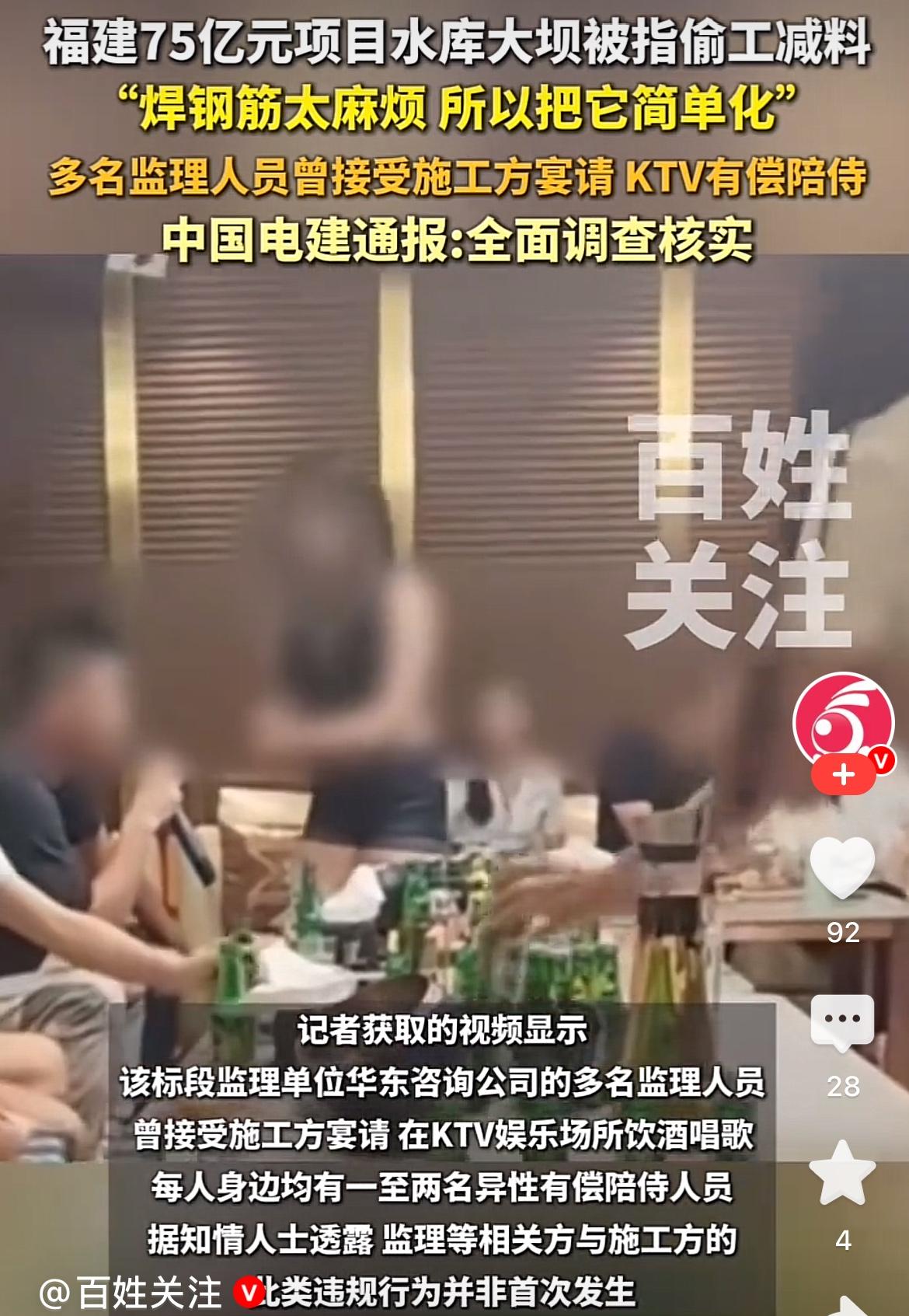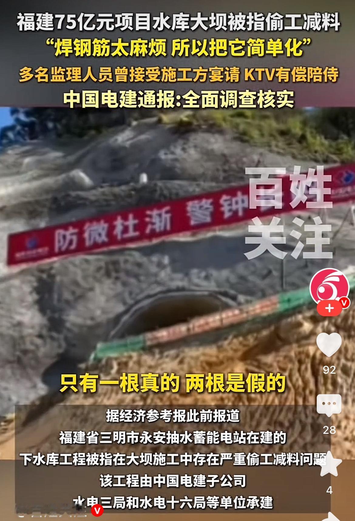 太好了! 终于让全国人民都知道了, 75亿的水库大坝竟然是豆腐渣工程!幸亏现在发现的及时,如果投入使用了,那麻烦就更大了! 看到媒体爆料的,一系列的偷工减料行为,真的让人瞠目结舌。 合同要求的锚筋桩12米,实际只有三四米,工人说七成都是残次品!更让人气愤的是灌装水泥都没有,只在两头封口水泥。 更让人气愤的是多个监理人员接受施工方的有偿陪侍。竟然还有这种操作! 幸亏现在发现了,严查严打,不然投入使用了要坑害多少老百姓!