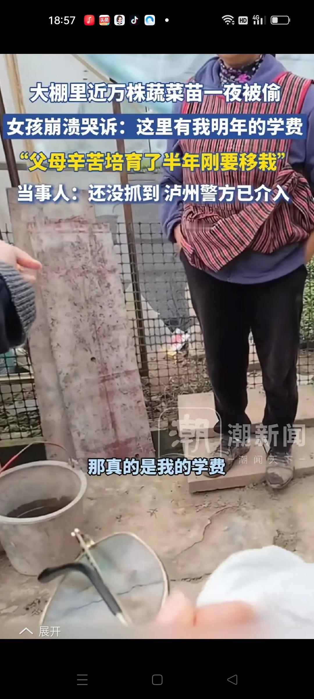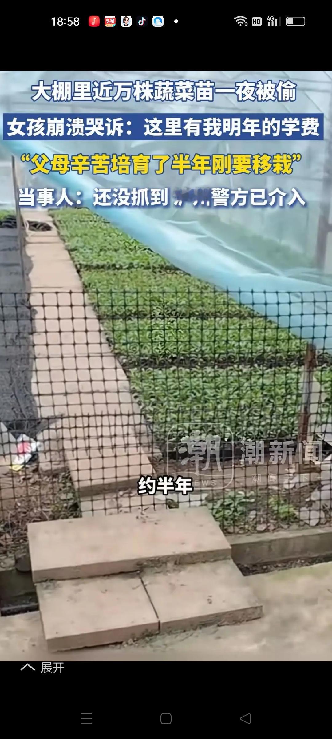 大棚里近万株蔬菜苗一夜被偷,女生崩溃爆哭:“这里是我明年的学费,父母辛苦培育了半年。家里条件不好,每年就等这笔钱过日子!”网友:偷农民菜苗,断孩子学路。这样的人遭天打五雷轰吧! 当夜幕降临,繁星点点,本应是农民辛勤劳作、期待丰收的时刻,却发生了一件令人心碎的事——大棚里近万株蔬菜苗一夜之间被盗。这不仅仅是一片绿意的消失,更像是一份希望的破碎。尤其令人心疼的是,那个站在废墟前崩溃哭泣的女生,她的声音带着绝望:“这里是我明年的学费,父母辛苦培育了半年。家里条件不好,每年就靠这笔钱过日子!” 这样的场景,令人心碎,也让人愤怒。有人会说,偷菜苗算什么?但仔细想想,这背后折射出的是多少家庭的无奈与挣扎。农民的辛勤劳作,换来的不是丰收的喜悦,而是眼睁睁看着一夜之间付诸东流的希望。那位女生的眼泪,代表着无数像她一样的孩子和家庭,他们的未来就系在这几株蔬菜苗上。 网友们纷纷谴责:“偷农民菜苗,断孩子学路。这样的人,天打五雷轰吧!”的确,偷窃行为本身就是对社会道德的挑战,但更令人愤怒的是,这种行为背后折射出的是社会底层的无奈与无助。有人说,偷窃的终究是心中那份渴望生存的欲望,但我们更应该反思:这个社会,是否给予了他们足够的温暖和希望? 这起事件,不仅仅是一起盗窃案,更像是一面镜子,映照出我们这个社会的某些角落。贫困、无助、希望与绝望交织在一起,让人不禁思考:我们到底在追求什么?是物质的富足,还是精神的温暖?每一株苗的失去,都像是一份梦想的破碎,每一滴泪水,都在诉说着无声的呐喊。 或许,我们都应该从这件事中汲取一些力量。不要让那些无助的人在绝望中迷失自己,更不要让社会的温情变得冷漠。我们每个人都可以成为那束光,点亮别人的希望。也许,下一次,是我们伸出援手的那一刻,是我们用行动守护这份温暖的时刻。 最后,希望每一个像那个女生一样的孩子,都能在这个社会找到一片属于自己的希望土地。让我们用行动告诉他们:他们不是孤单的,我们都在这里,愿意为他们撑起一片天。因为,真正的强大,不是没有困难,而是在困境中依然坚持微笑,依然相信明天会更好。菜地盗窃 菜苗大棚 去地里偷蔬菜瓜果的人善良吗?