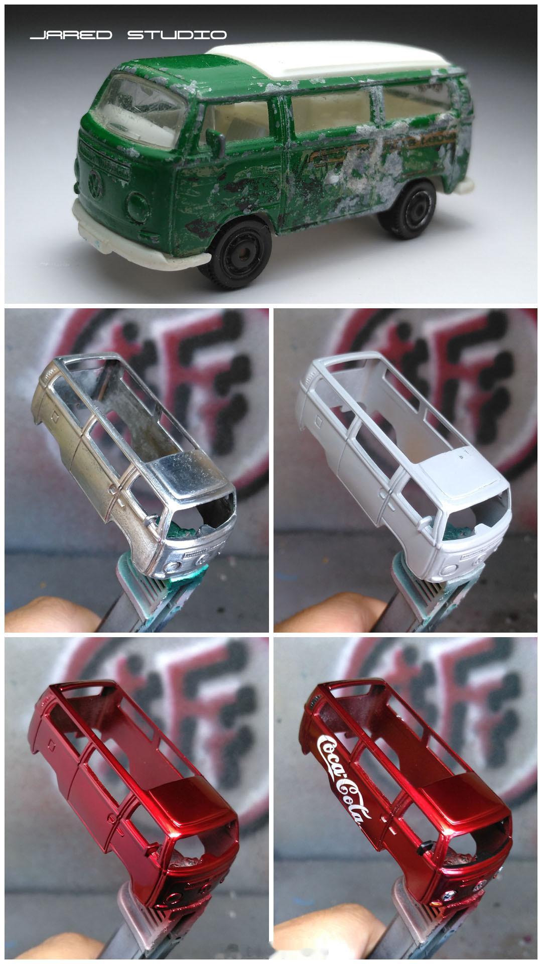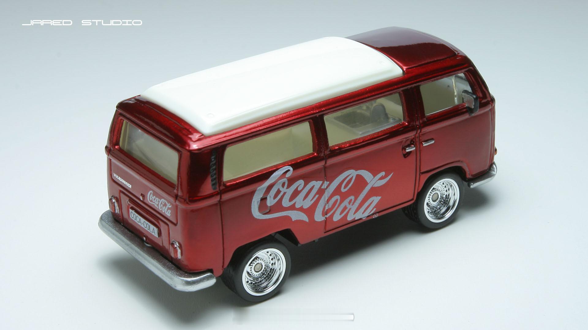 完工一辆美太火柴盒大众T2翻新,按客人要求做成电光红底色的可口可乐涂装,手绘车灯,换胶胎车轮。