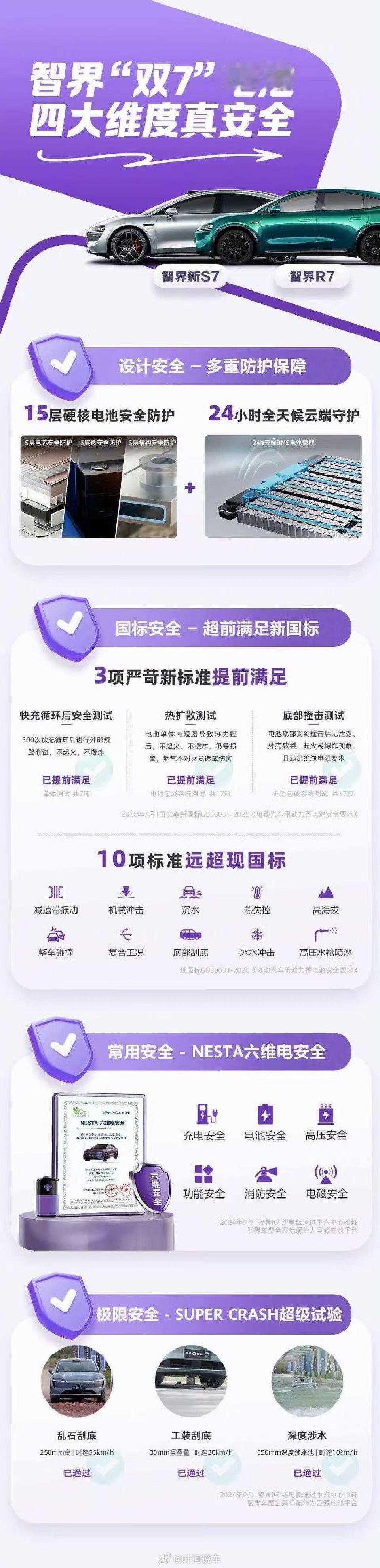 电池安全拒绝“纸上谈兵”,只要看得见的踏实安全,是一切豪华与体验的基石智界R7十万公里电池安全挑战 智界新S7与智界R7搭载的华为巨鲸800V高压电池平台,以三项硬核安全测试,重新定义了行业电池安全标准【测试一】在十万公里电池健康度测试中,巨鲸电池包依旧保持97%的健康度,真正实现“用得久、衰减慢”,彻底打消用户对电动车电池寿命的顾虑【测试二】在极限火焰炙烤测试中,车辆以5km/h速度穿越800℃高温“火龙”长达72秒,超越国标70秒要求,电池包依然稳定无异常,展现出在极端高温环境下的安全实力【测试三】三元锂动力电池户外针刺实验,模拟日常驾驶中异物侵入电池包的危险场景,巨鲸电池在穿刺后仅冒烟、无明火,BMS系统毫秒级响应并联动车内仪表警示、双闪自动打开、门把手自动弹出,真正做到“危险可控、逃生有时”这些安全表现的背后,是巨鲸电池全链路黑科技的支撑。15层安全防护体系构建起五层电芯防护、五层热安全拦截与五层结构装甲,结合AI预警+BMS毫秒级响应+云端协同守护,实现“单电芯失控,整包永不起火”。再加上华为严苛制造工艺与超国标测试验证,巨鲸电池不仅在续航、快充上领先,更在安全上树立了“天花板级”的保障
