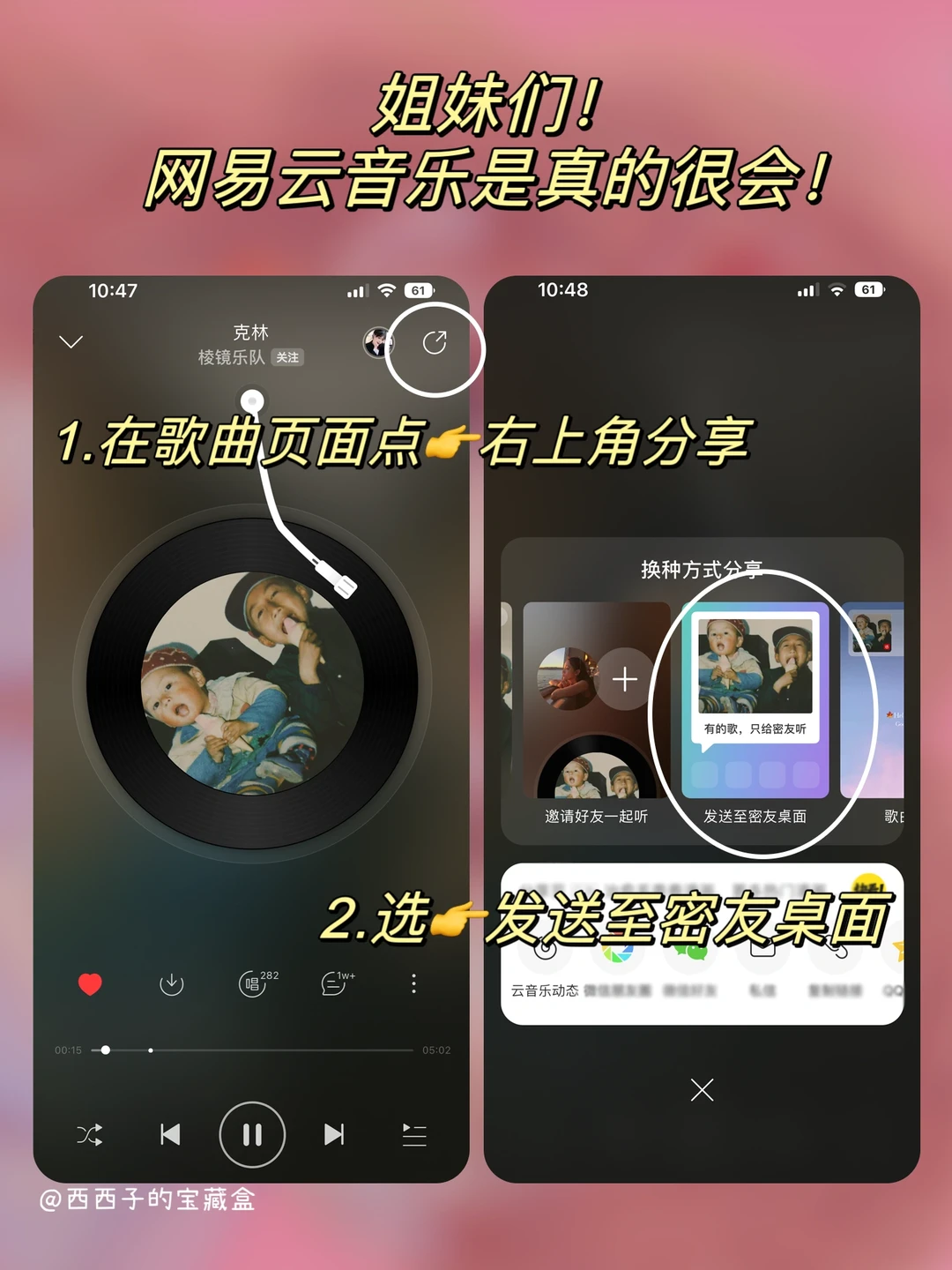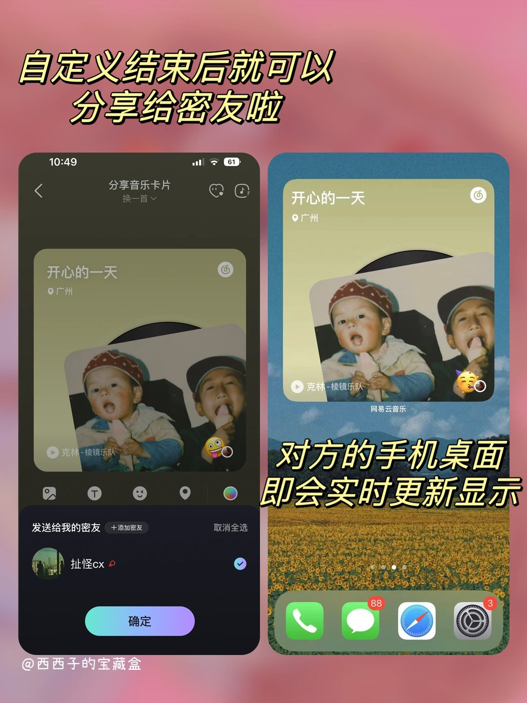 ❤️当你听到一首自己喜欢听的歌时,可以通过隐藏功能「音乐桌面密友」,把这首歌曲直接弹到对方手机桌面!