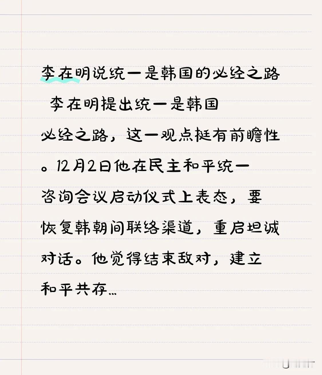 李在明说统一是韩国的必经之路 李在明称 统一是韩国必经之路 此观点颇具前瞻性 12月2日 在民主和平统一咨询会议启动仪式上 他表态要恢复韩朝联络渠道 重启坦诚对话 他认为 结束敌对 建立和平共存新关系是时代课题 还提及从气候、环境等领域推动双方合作 对于无核化 他也表示会持续努力 他强调 统一需通过和平且各方都能接受的方式 在半岛局势复杂的当下 若这一主张能落实 或许能给朝鲜半岛带来新的和平曙光 推动双方共同发展 李在明 李在明韩国大选 李在明简历 韩国来历 韩国站队美国