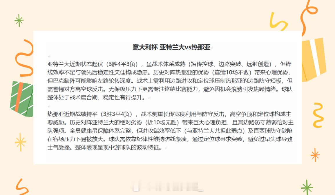 两场意大利杯情报亚特兰大 vs 热那亚那不勒斯 vs 卡利亚里