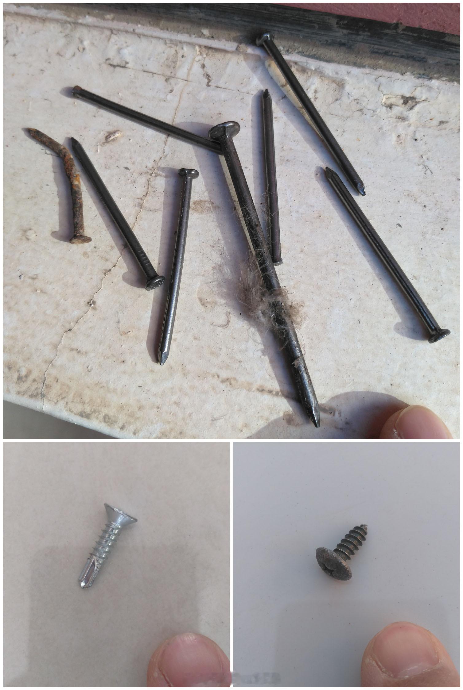 这是在一家正在装修的底商前面捡到的,貌似是木工的东西撒了一地,剩下这些钉子螺丝不