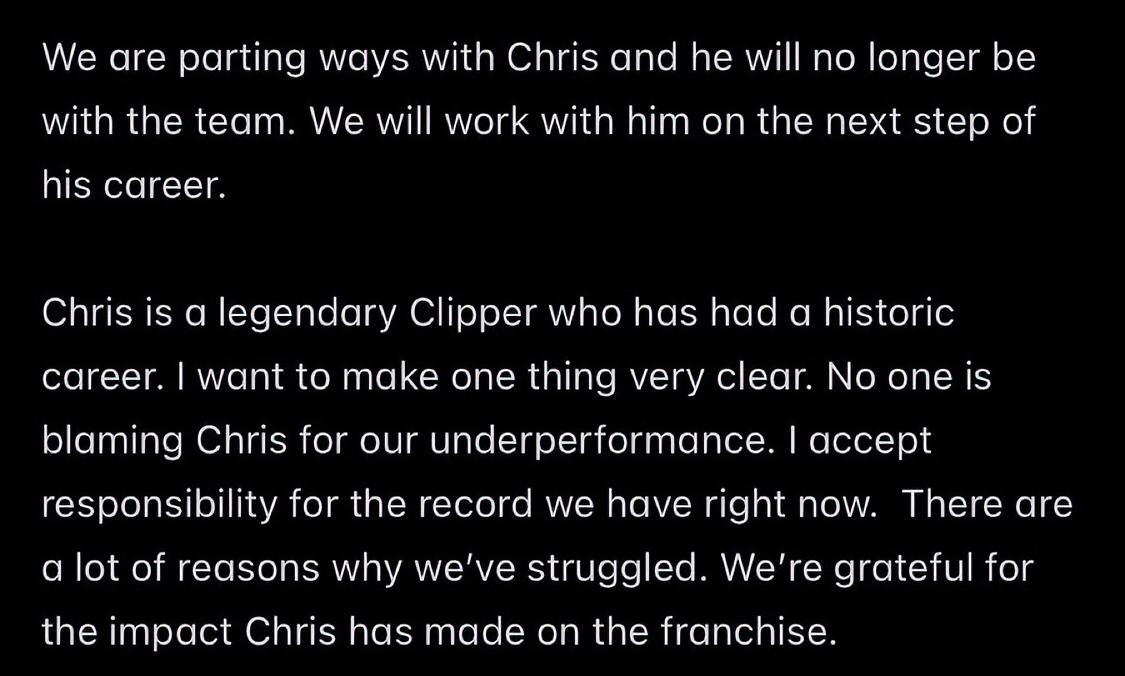 保罗离队不是坏事! 太突然了!快船官宣结束与克里斯保罗的合作,而且是在客场之旅中连夜将老炮送回了洛杉矶!首先我们要明确一点,这绝对是快船的单方面决定,因为不久前保罗才官宣了最后一季,他肯定没有中途退出的打算,而且保罗刚更新了社媒:“我被通知,要被送回家了!”那么为何快船如此决绝呢?我认为主因大概率是以下两点: 1.根据美记报道,保罗在亚特兰大连夜被球队送走,意味着事情的突发性,联系球队本赛季的战绩,他们的更衣室想必已失控,前两天鲍尔默已亲自问责,保罗职业生涯场内场外都是领袖作派,很可能他的发声激化了内部更大的矛盾。 2.保罗早前宣布了自己的最后一季,通常这会让球队受到场外因素干扰,对争取战绩不利,快船明年的首轮签在雷霆手里,没有任何摆烂价值,这批球员必然承受着舆论压力,快船想排除这个负面因素。 快船本赛季战绩拉胯有多方面原因,引援效果不佳、核心老化、伤病及运气等,保罗这个年龄只想找个离家近的地方上班,不管自身状态是否断崖式下滑,都和球队成绩扯不上太大关系,让他当替罪羊并不合适!但要说快船完全不通情达理也为时尚早,毕竟今年休赛期他们还是给了保罗一份合同,只能等等看球队是否公布更多细节! 目前管理层并未直接表明是直接裁掉保罗还是等待12月15日以后进行交易,尽管不能在效力了多年的母队完成退役巡演,但至少老炮现在获得了一个重新选择的机会,众所周知保罗职业生涯荣誉无数,但由于季后赛的伤病和发挥等原因,始终未能染指总冠军,寻找一支争冠球队加盟,兴许还能在要劲的系列赛中燃烧最后一点能量,这个节点还不算晚,相信中期截止日前他一定会进行尝试,塞翁失马焉知非福,调整好心态最后一舞吧!
