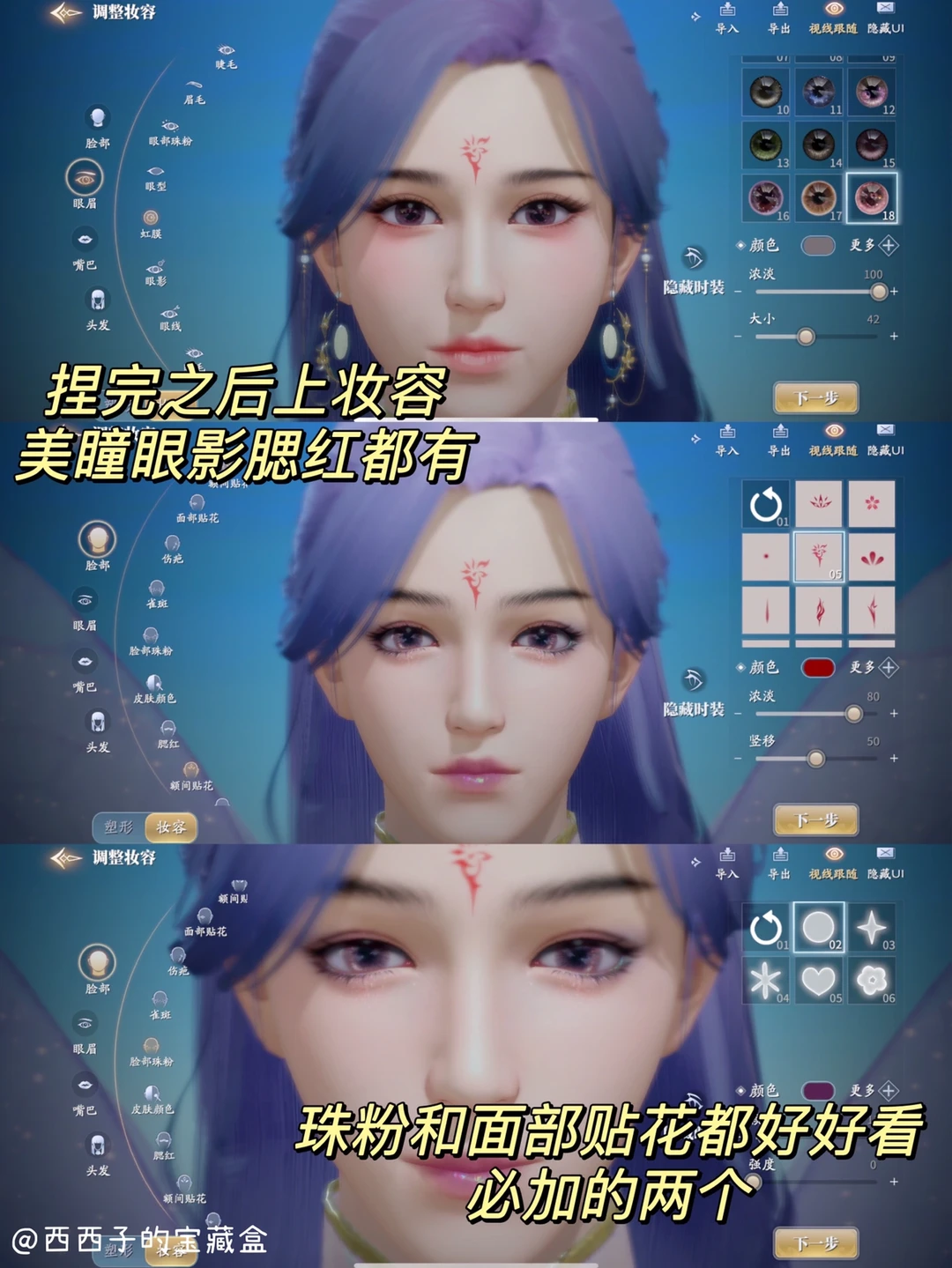 捏完脸部后还可以给人物上妆,🤔除了常规的肤色,眼影腮红,还有多种面部/额间贴花可以选,并且可以移动贴花的位置和调整贴花的颜色。✨小仙女们一定要记得上珠粉,西西子感觉这是整个妆容是否仙气的灵魂所在!