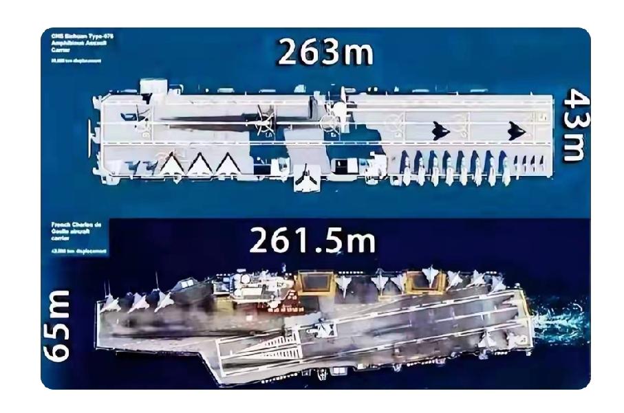 美媒说我国076四川舰超法国戴高乐号核动力航母,是有依据的。076舰长263米,排水量约5万吨,戴高乐号舰长261.5米,标准排水量仅4.25万吨,076在体型上就实现了“量级压制”,更大舰体带来更强载荷能力。 在舰载机出动能力方面,戴高乐号有两条蒸汽弹射器,076只有一条电磁弹射器,但电磁弹射比蒸汽弹射先进一代,076只需一分半钟就能弹射一架舰载固定翼战机升空,出动能力超过戴高乐号。从战术定位看,076是强大投送平台,适合近海作战。所以,不管是纸面数据还是实战潜力,076四川舰超越戴高乐号都在情理之中。
