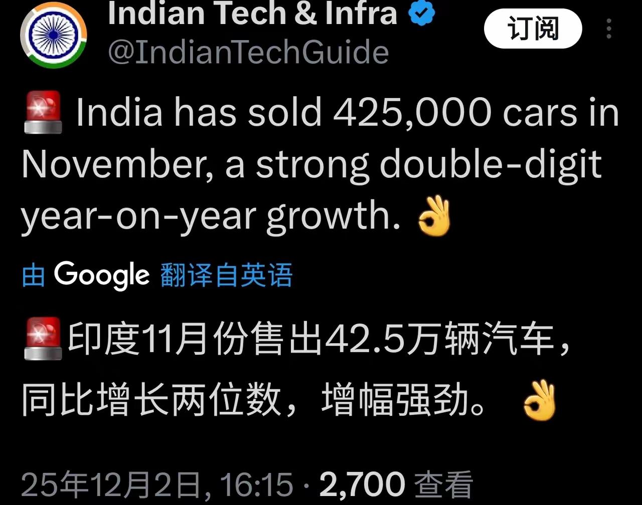 印度科技与基础设施报报道:“印度汽车正在蓬勃发展” 该媒体表示,印度11月份汽车销量高达42.5万辆,势头强劲,印度汽车行业一片火热。 一个15亿人口的超级人口大国,所有车企加起来一个月才卖42.5万汽车,印度媒体就如此骄傲自豪。 如果让他们知道中国单单比亚迪一个车企一个月就卖了47万辆,不知道印度媒体会作何感想。 当然,按照印度媒体的性格,就算知道他们也不会报道出来! 中国11月份乘用车终端销量约215万辆,是印度整整的五倍!