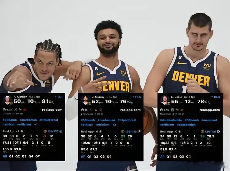 联盟最恐怖进攻大队?穆雷11中10砍52分,掘金3人50+扎堆,他们的50+表现谁最惊艳?1、约基奇:55分2025年11月13日,掘金客场130-116击败快船的比赛里,约基奇出战33分钟,23中18,其中三分6中5,罚球16中14,拿到55分12篮板6助攻1抢断1盖帽,正负值+282、穆雷:52分2025年12月4日,掘金客场135-120轻取步行者,穆雷出战36分钟,25中19,其中三分11中10,罚球5中4,拿到52分6篮板4助攻1抢断,正负值+233、戈登:50分2025年10月24日,掘金客场加时131-137不敌勇士,戈登出战38分钟,21中17,其中三分11中10,罚球6中6,拿到50分8篮板2助攻1盖帽,正负值-2三人三种风格,一个靠精准封神,一个靠全能霸榜,一个靠暴力碾压,每一场50+都看得人热血沸腾!你们觉得掘金这三人的50+表现,谁最让你印象深刻呢?nba穆雷爆砍52分